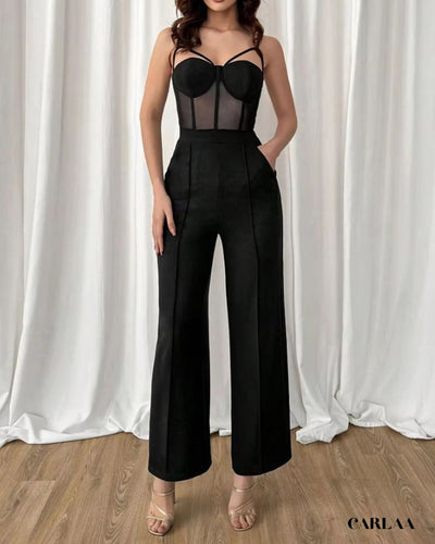 L'élégance se fait audacieuse avec cette combinaison noire ornée de broderies florales. Le tulle transparent et les motifs appliqués offrent un contraste charmant avec la sobriété du noir, tandis que la coupe ajustée met en valeur la silhouette avec grâce.