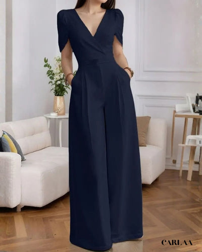 La simplicité rencontre le chic dans cette combinaison bleue aux détails subtils. Son col bateau et ses manches courtes ajoutent une sophistication discrète, tandis que la ceinture à nouer marque la taille avec finesse. Elle est l'incarnation même de l'élégance intemporelle.