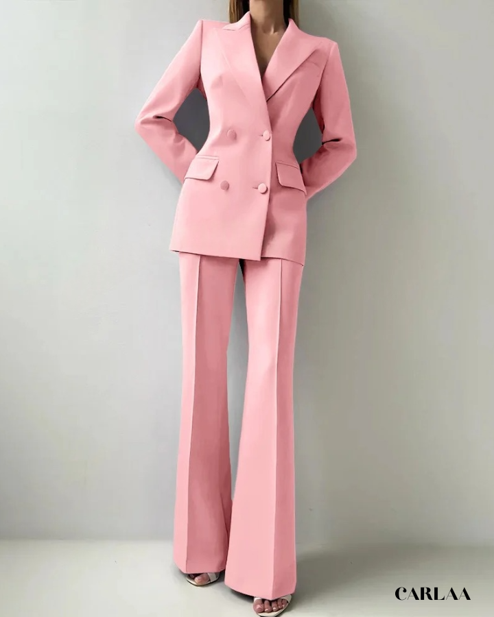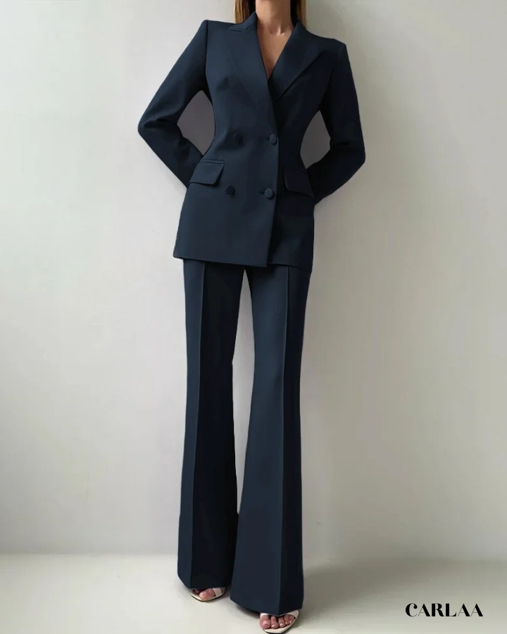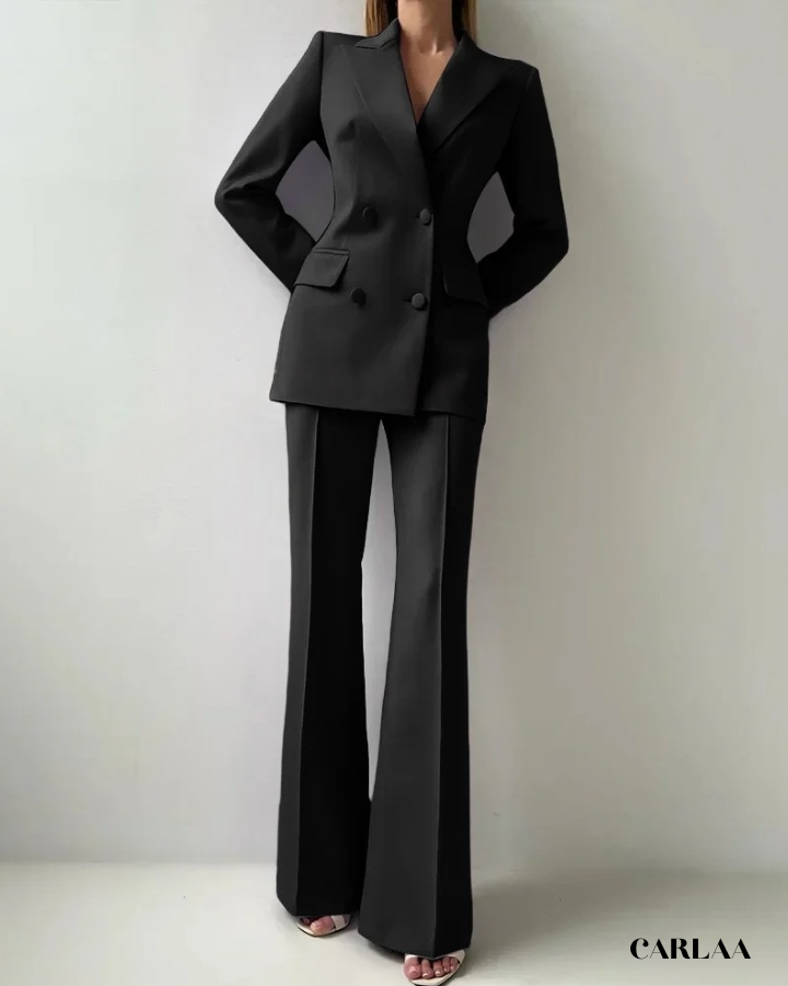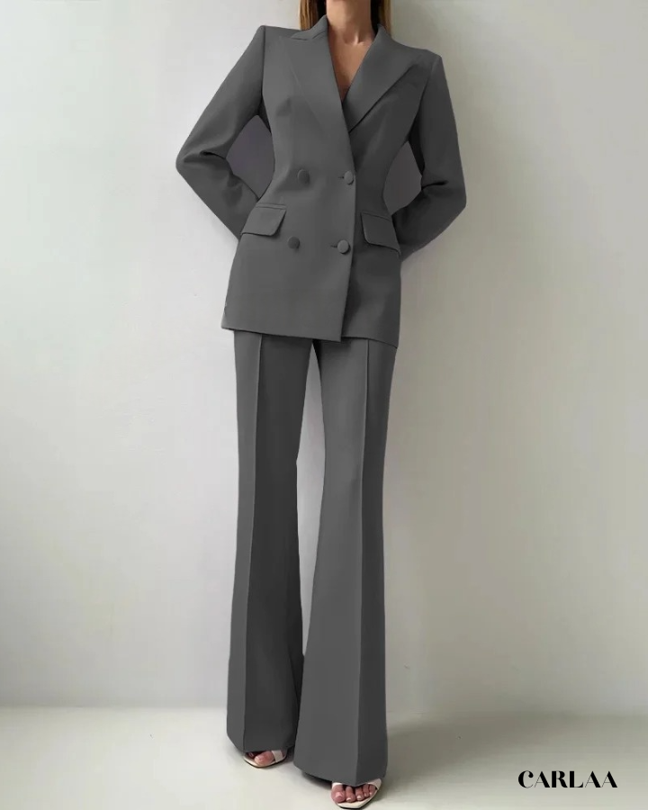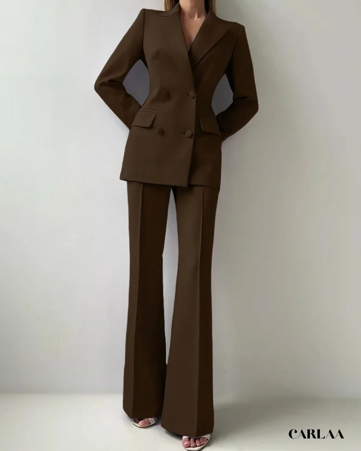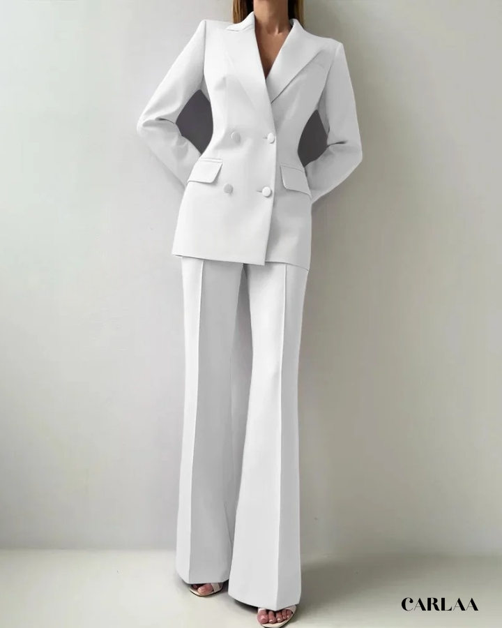Le blazer croisé oversize arbore des revers larges et structurés qui créent cette silhouette architecturale puissante et résolument contemporaine. Les boutons ton sur ton et les poches à rabat fonctionnelles ajoutent ces détails pratiques qui allient élégance et fonctionnalité avec intelligence. La coupe allongée du blazer crée une ligne verticale flatteuse qui sculpte ta silhouette avec sophistication. Le pantalon droit à pli marqué tombe impeccablement jusqu'au sol et allonge tes jambes pour un effet statuesque saisissant. Ce cérémonie tailleur femme mariage représente le choix parfait pour toutes les occasions spéciales: mariages civils, cérémonies laïques, baptêmes chics, événements professionnels prestigieux ou comme invitée d'honneur stylée.