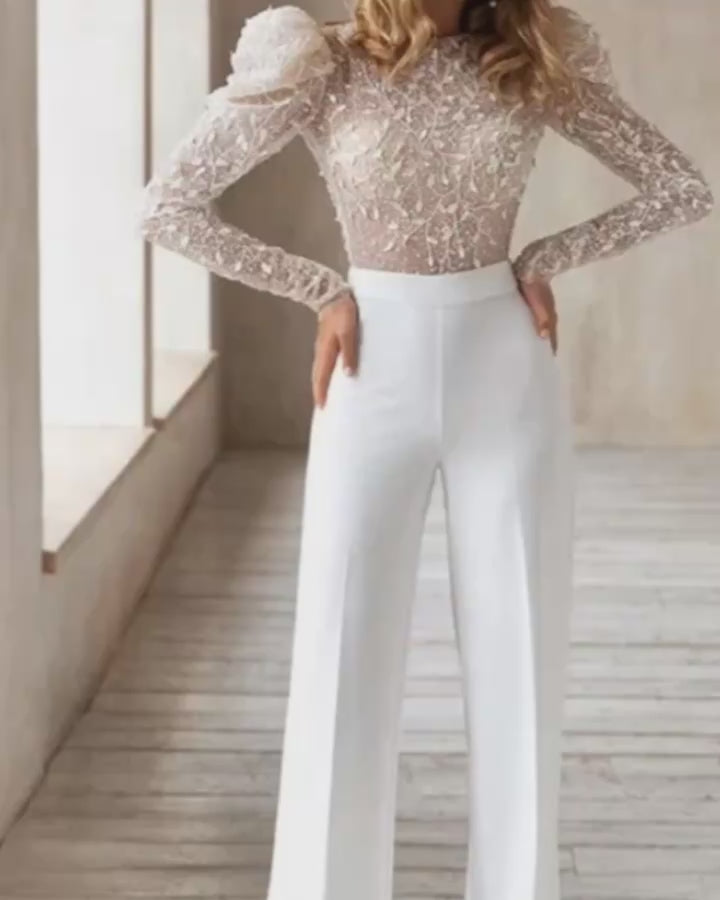 Le haut est un chef-d'œuvre de dentelle blanche et de maille, conçu avec des manches longues qui ajoutent une touche de sophistication discrète. Cette délicate superposition crée un jeu subtil de transparence, conférant à la combinaison un charme unique.