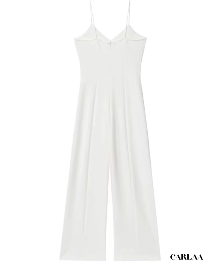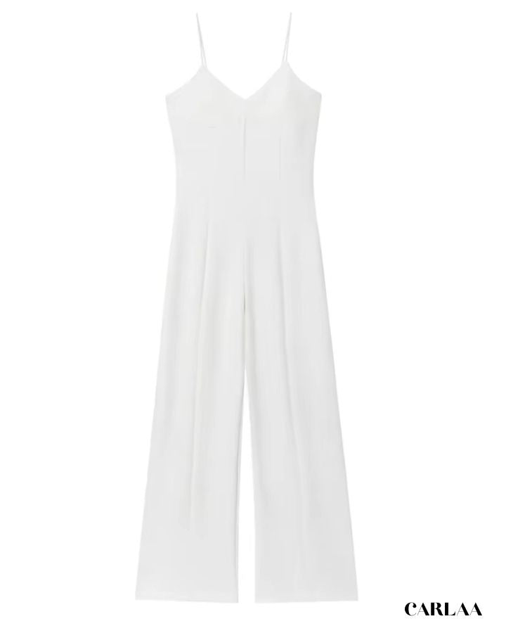 Élégante et minimaliste, cette combinaison blanche à jambe large allonge la silhouette et met en valeur chaque mouvement avec grâce.