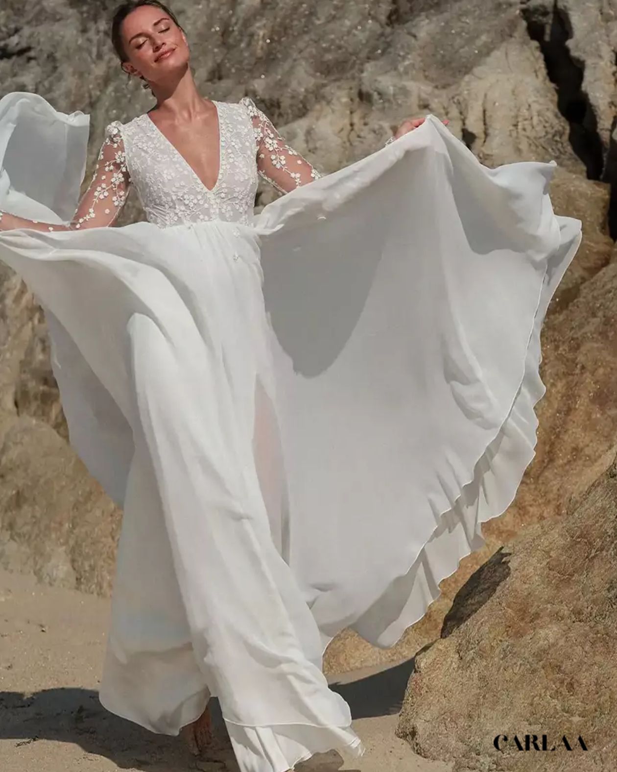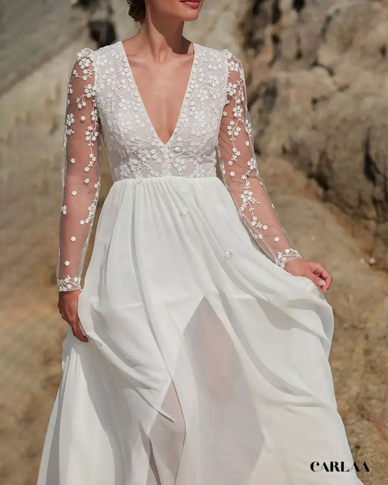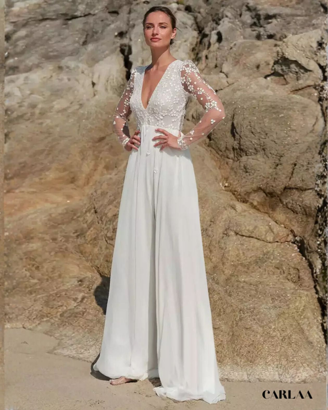 Le corsage entièrement brodé de dentelle florale tridimensionnelle avec ses petites fleurs blanches perlées et ses feuillages délicats crée un jardin féerique sur ta peau, tandis que le décolleté plongeant en V sublime ta féminité avec une sensualité douce et raffinée. La taille empire haute soulignée d'un délicat ruban de satin marque ta silhouette au point le plus flatteur avant de laisser place au pantalon palazzo fluide qui tombe en vagues soyeuses jusqu'au sol, créant ce mouvement aérien si caractéristique du style bohème. Le tissu léger et vaporeux du pantalon flotte élégamment à chaque pas et ondule magnifiquement au gré de la brise marine, parfait pour une cérémonie en bord de mer, dans un jardin luxuriant ou sur une plage de sable fin.
