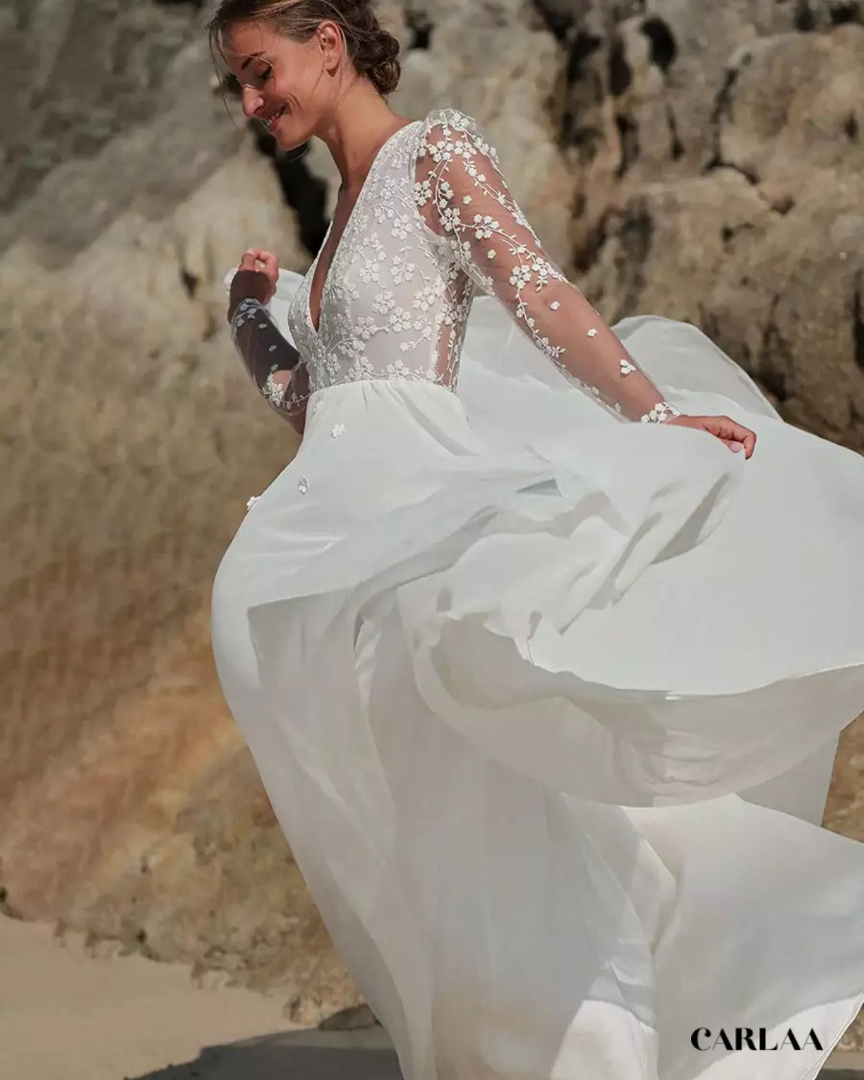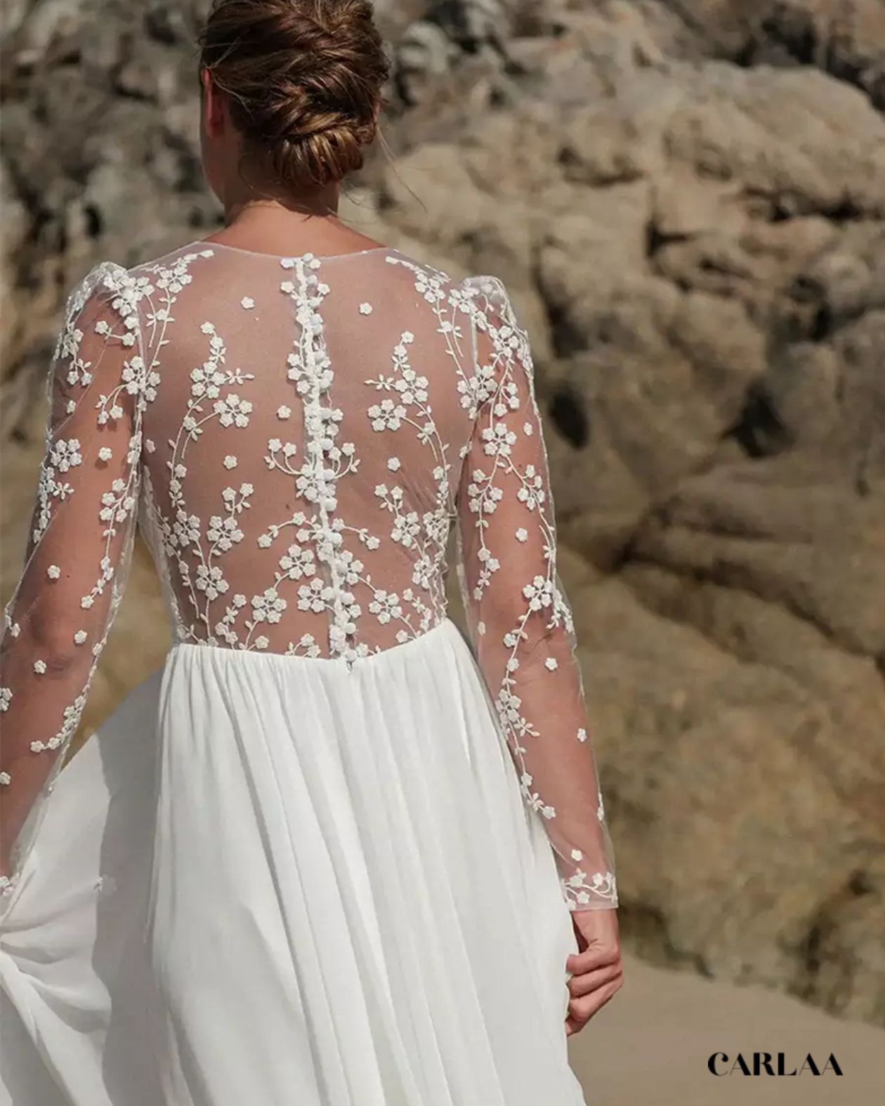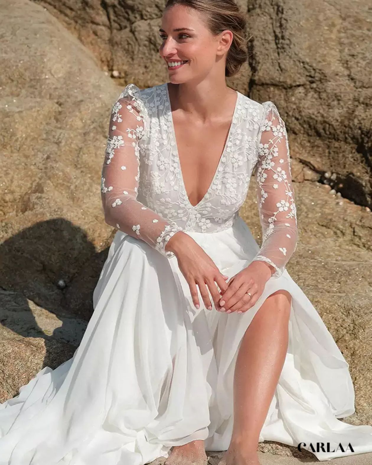 Le corsage entièrement brodé de dentelle florale tridimensionnelle avec ses petites fleurs blanches perlées et ses feuillages délicats crée un jardin féerique sur ta peau, tandis que le décolleté plongeant en V sublime ta féminité avec une sensualité douce et raffinée. La taille empire haute soulignée d'un délicat ruban de satin marque ta silhouette au point le plus flatteur avant de laisser place au pantalon palazzo fluide qui tombe en vagues soyeuses jusqu'au sol, créant ce mouvement aérien si caractéristique du style bohème. Le tissu léger et vaporeux du pantalon flotte élégamment à chaque pas et ondule magnifiquement au gré de la brise marine, parfait pour une cérémonie en bord de mer, dans un jardin luxuriant ou sur une plage de sable fin.