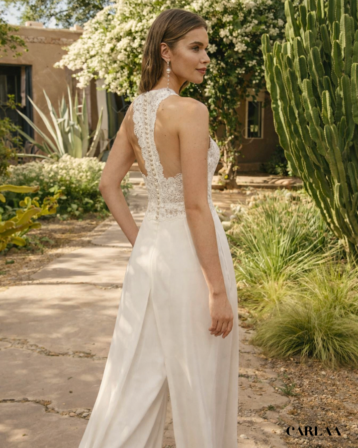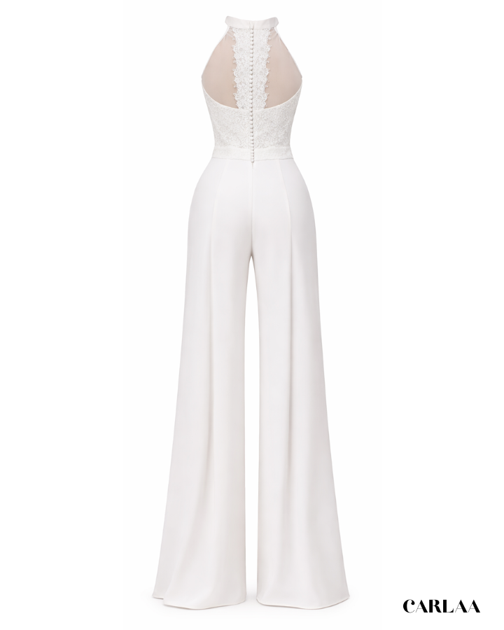 Parfaite pour la mariée moderne qui cherche à se démarquer avec une tenue chic et raffinée. Associe cette combinaison à des accessoires minimalistes pour un look sophistiqué et inoubliable. Cette pièce est un choix parfait pour un mariage mémorable.