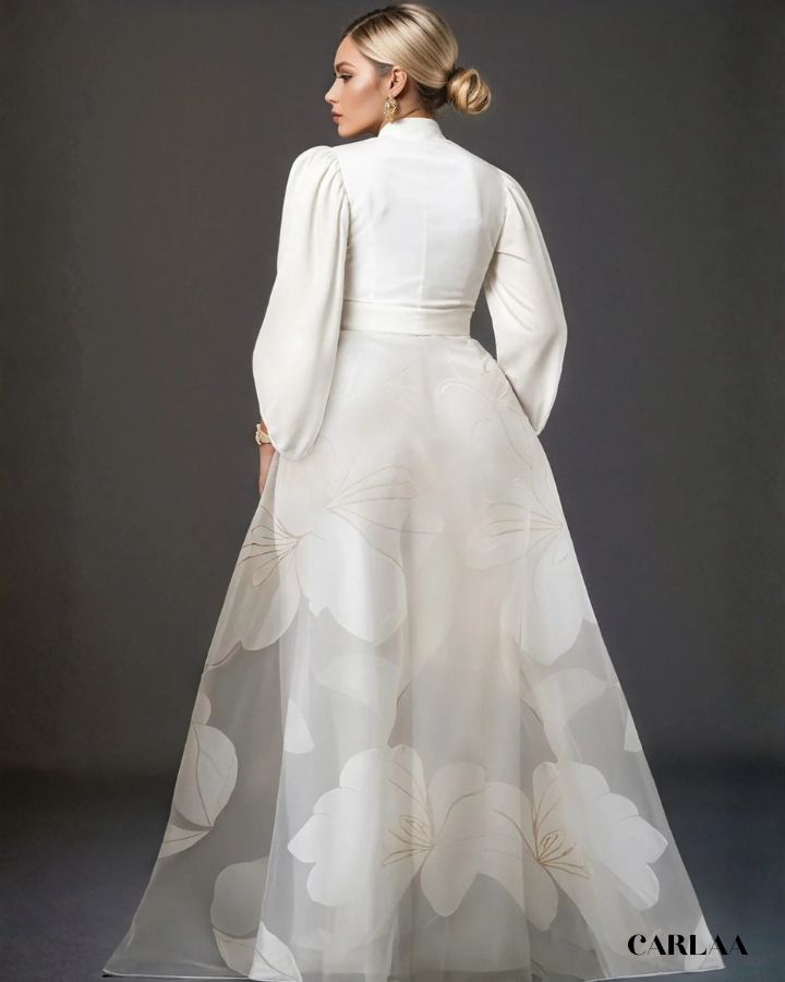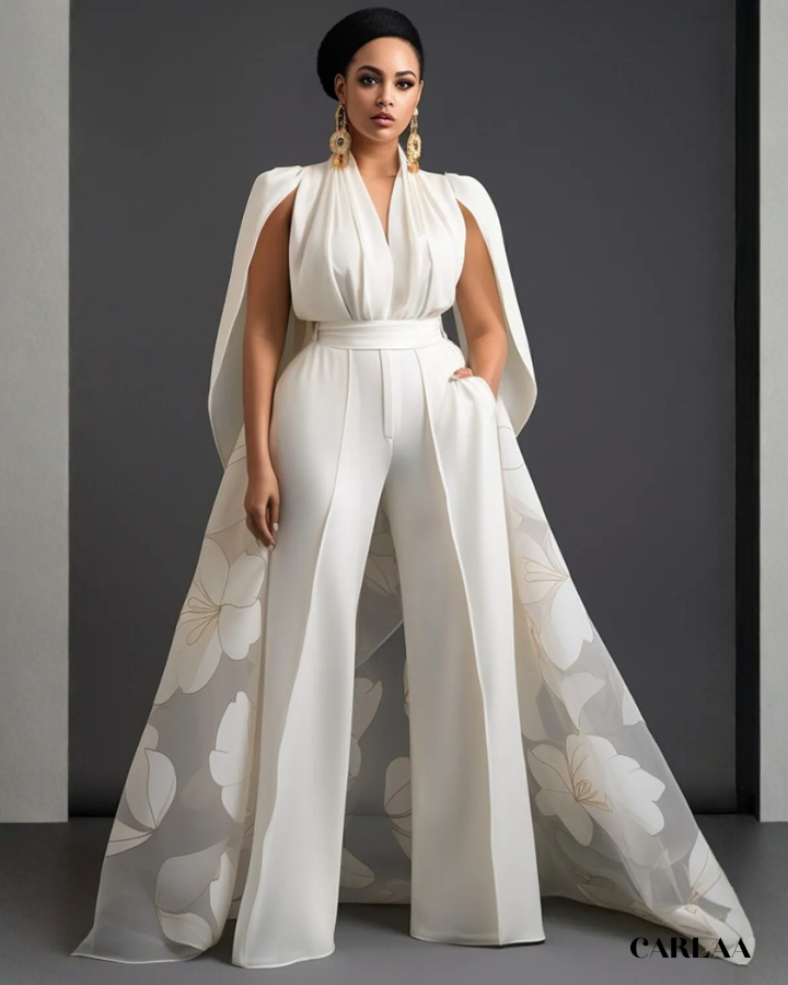 Le bustier drapé sans manches au décolleté en V plongeant célèbre tes courbes généreuses avec une sensualité maîtrisée et élégante. Les épaulettes structurées apportent cette dimension architecturale puissante tandis que la ceinture souligne ta taille avec grâce. Le pantalon palazzo à la coupe impeccable allonge ta silhouette avec fluidité tout en garantissant un confort absolu pour ton grand jour. Le détail signature réside dans cette majestueuse cape-traîne en organza transparent ornée de magnifiques motifs floraux XXL brodés dorés qui créent un effet spectaculaire digne de la haute couture. Cette sur-jupe amovible te permet deux looks en un : dramatique et théâtral pour la cérémonie, moderne et chic pour la réception. Cette création d'exception célèbre la mariée aux courbes généreuses qui refuse les conventions et ose affirmer son style avec audace, glamour et une présence inoubliable. Parfaite pour un mariage civil sophistiqué ou une célébration où tu souhaites marquer les esprits avec panache.