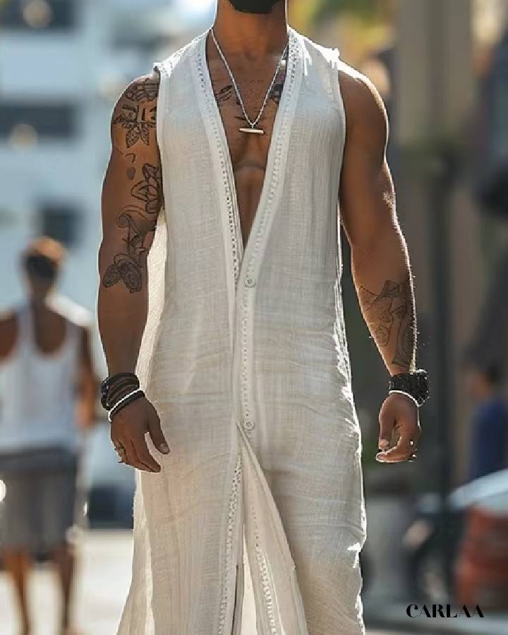 Cette combinaison homme mode se porte facilement avec des sandales ou des baskets, et peut être accessoirisée avec des bijoux et des lunettes de soleil pour un look encore plus percutant.