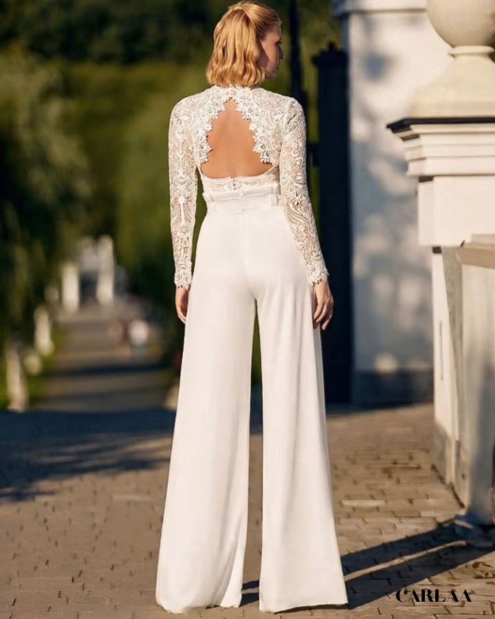 Élégante et raffinée, cette combinaison à manches longues en dentelle sublime la féminité avec son haut délicatement travaillé et son dos ouvert irrésistible.