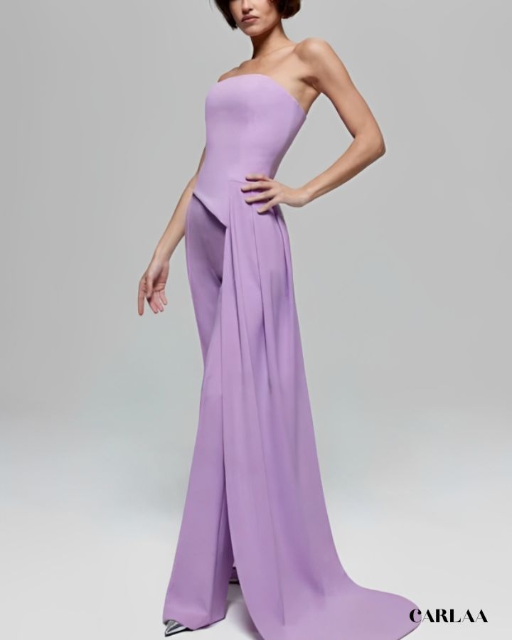 Son bustier droit souligne la féminité tandis que la jambe large et la draperie fluide créent une allure majestueuse. Idéale pour une cérémonie ou un cocktail, elle séduit par sa coupe structurée et sa teinte lavande ultra-tendance. Porte-la avec des sandales argentées et des bijoux délicats pour un look de mariage moderne et inoubliable.