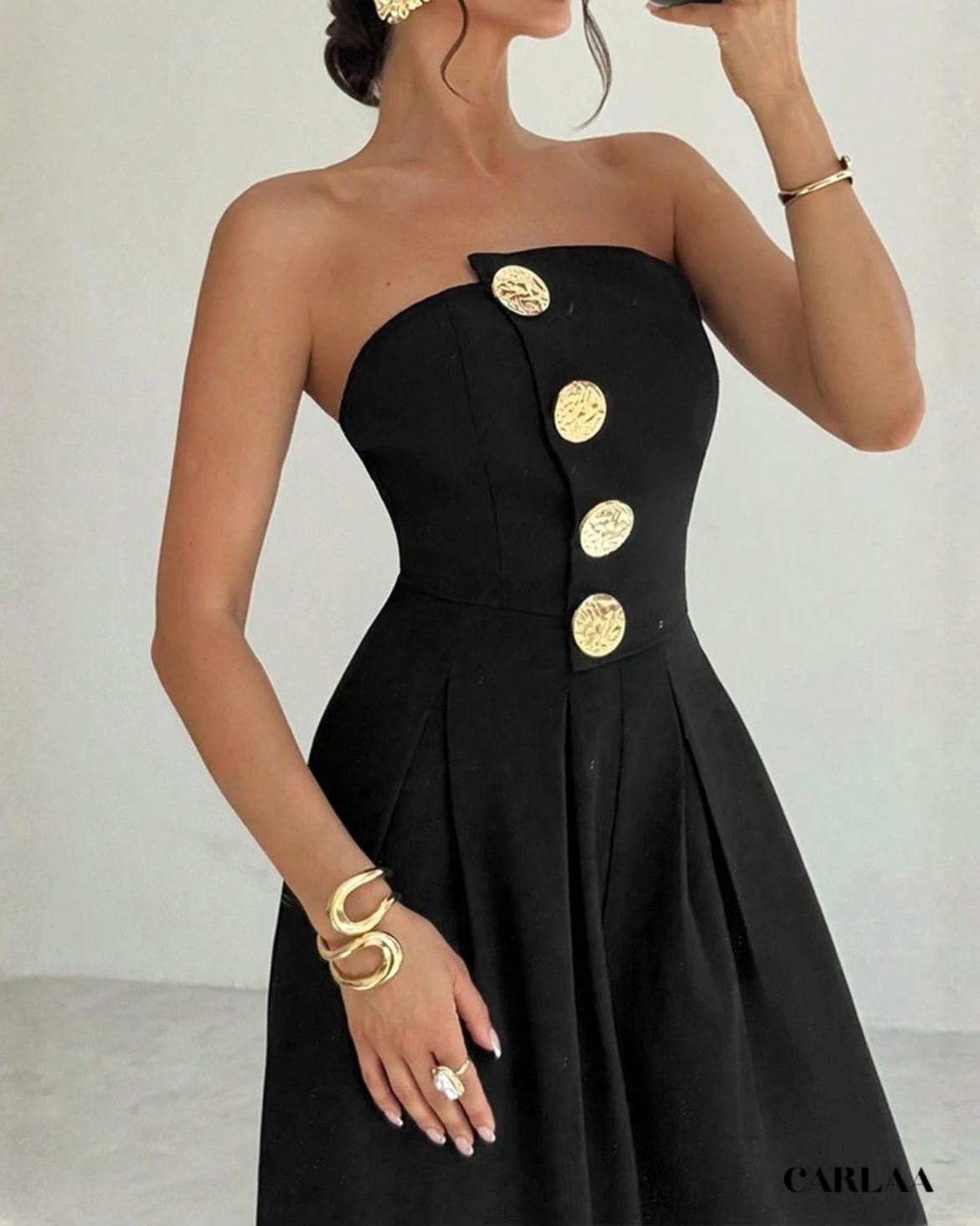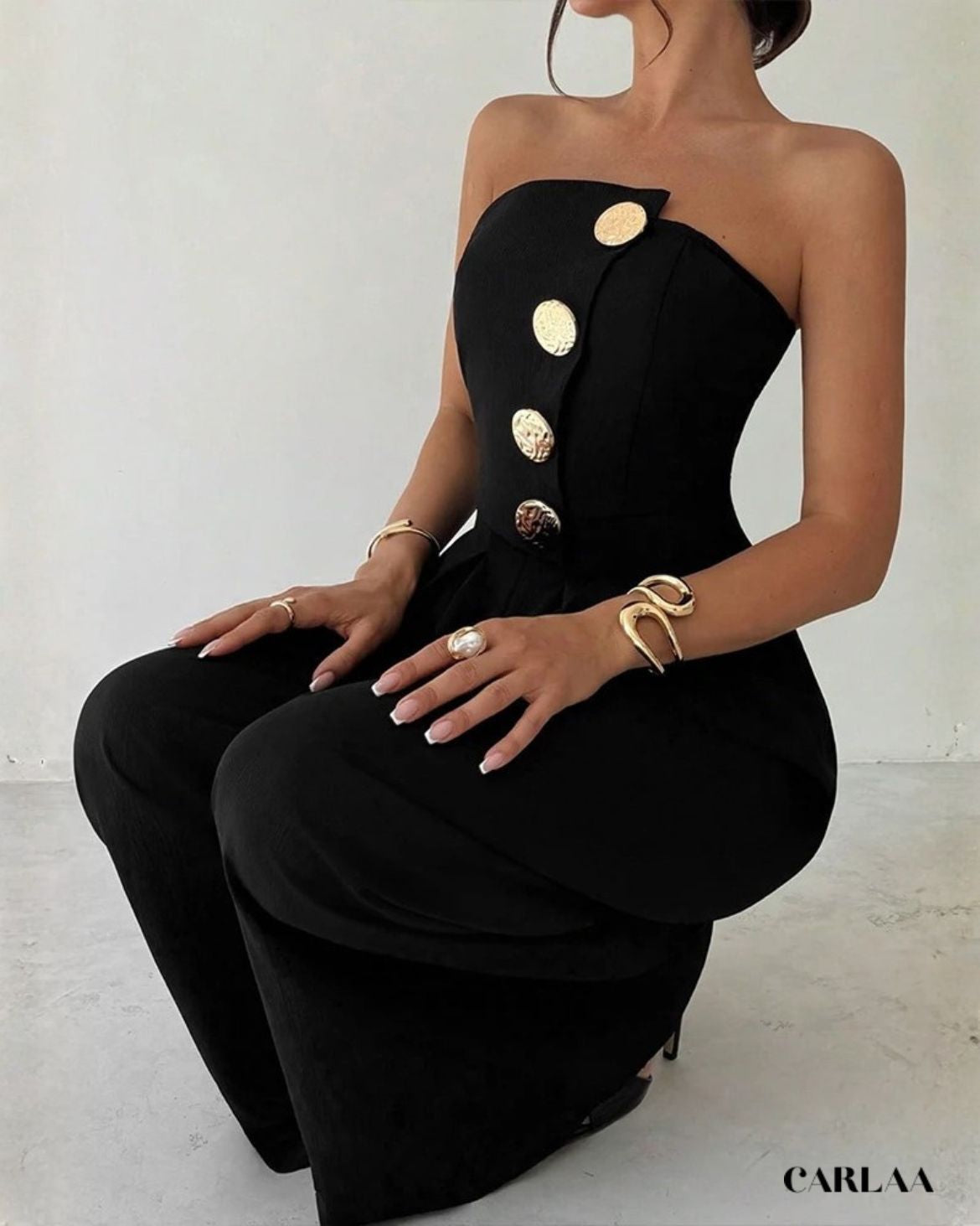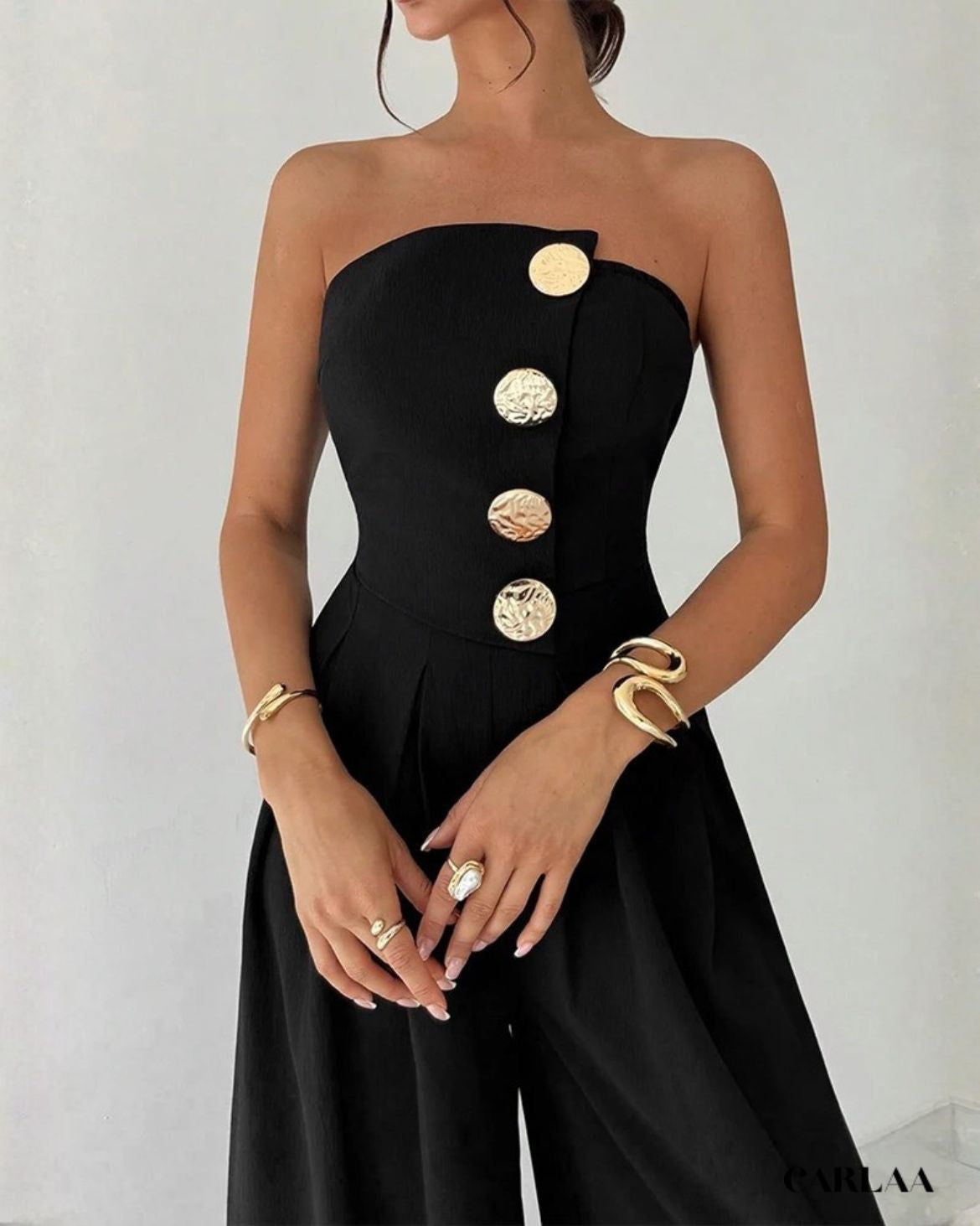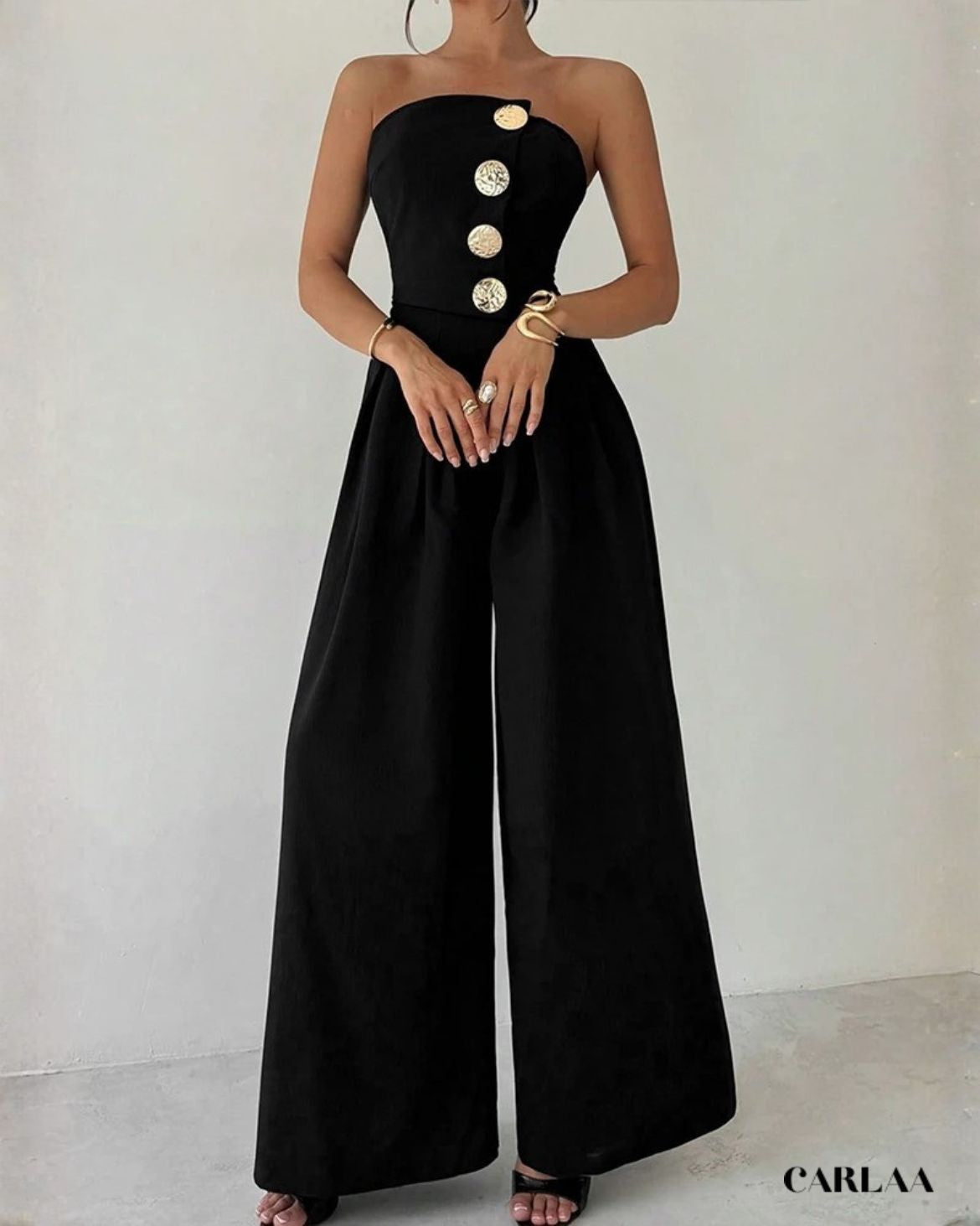 Le bustier bandeau épuré met en valeur tes épaules et ton décolleté avec une sensualité discrète, tandis que la rangée de boutons dorés martelés descendant en ligne verticale crée un point focal sophistiqué qui attire l'œil et ajoute une touche luxueuse à la simplicité du design. La coupe ajustée du buste épouse parfaitement tes courbes avant de s'ouvrir en un pantalon palazzo ultra-large aux jambes fluides qui tombent majestueusement jusqu'au sol, créant cette silhouette dramatique qui allonge infiniment ta stature. Le dos nu élégant ajoute une dimension sensuelle inattendue à cette pièce apparemment minimaliste, révélant juste ce qu'il faut de peau bronzée pour un effet wow garanti. Cette combinaison noir bustier femme incarne le chic parisien effortless, parfaite pour les cocktails sophistiqués, les vernissages artistiques, les dîners élégants ou toute occasion où tu veux projeter une élégance confiante et moderne. Accessoirise avec des créoles dorées statement, des bracelets multiples et des sandales à talons pour un look qui respire le luxe accessible!