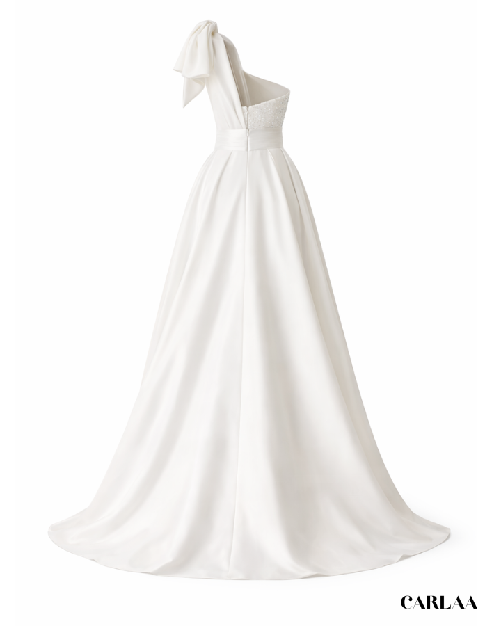 Son bustier orné de sequins scintille de mille feux, tandis que le drapé fluide ajoute une touche d'élégance. Avec son dos nu et ses détails raffinés, elle est conçue pour celles qui souhaitent sortir des sentiers battus le jour J.