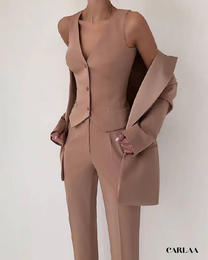 Le gilet cintré met en valeur ta taille et apporte une touche élégante et féminine, tandis que le pantalon à coupe droite élance ta stature avec naturel.