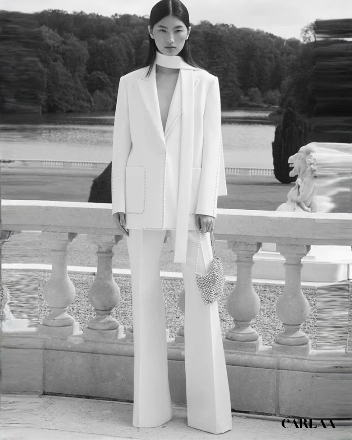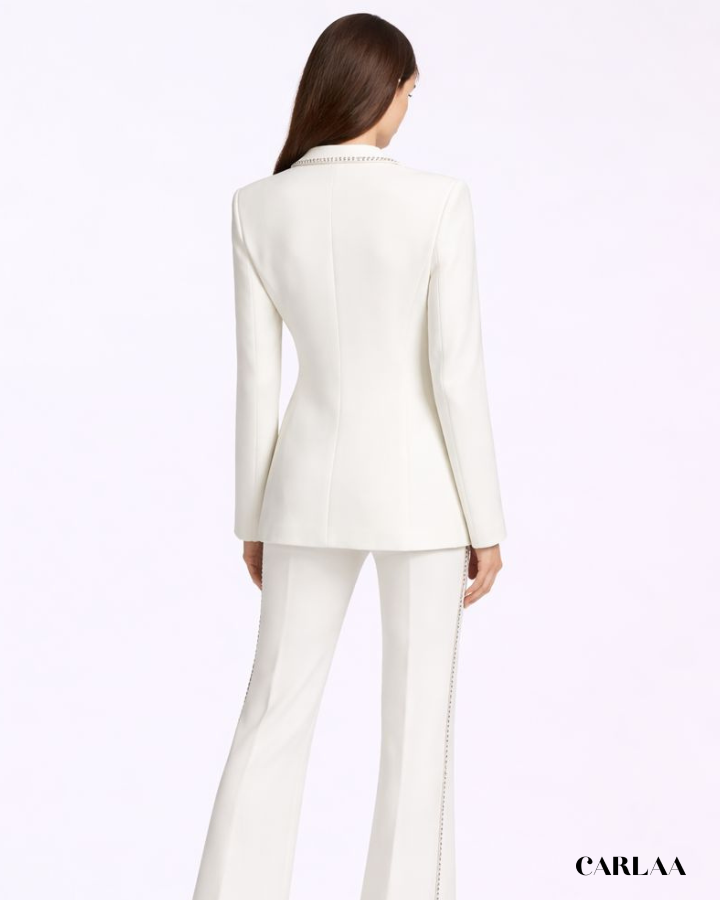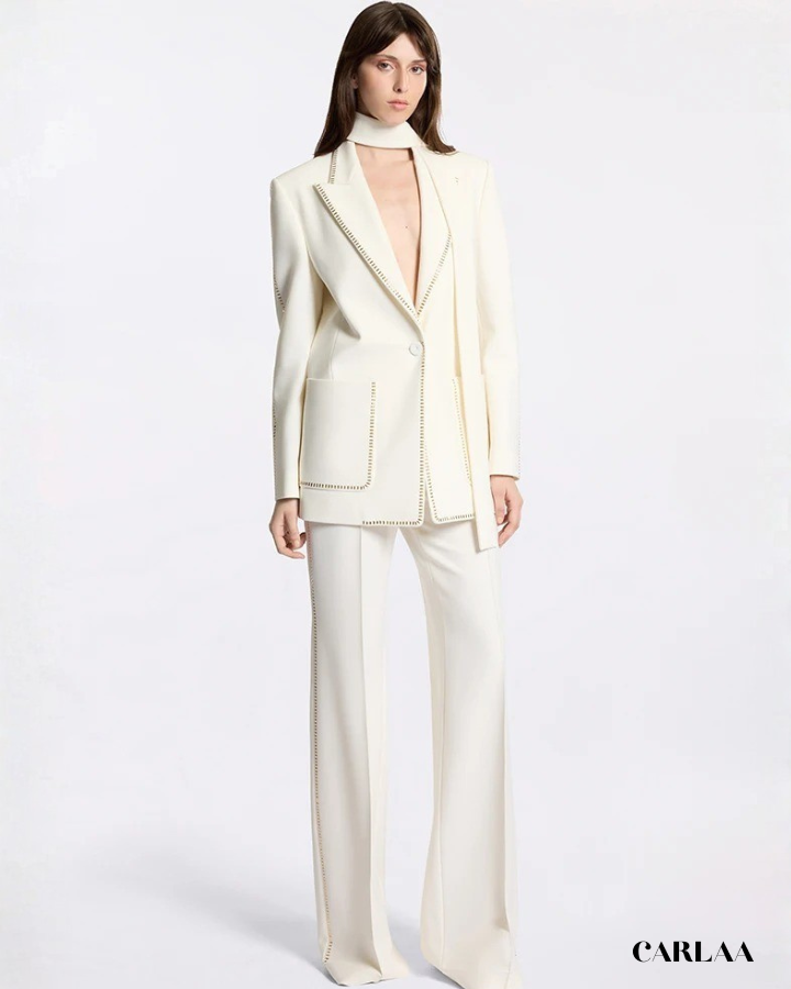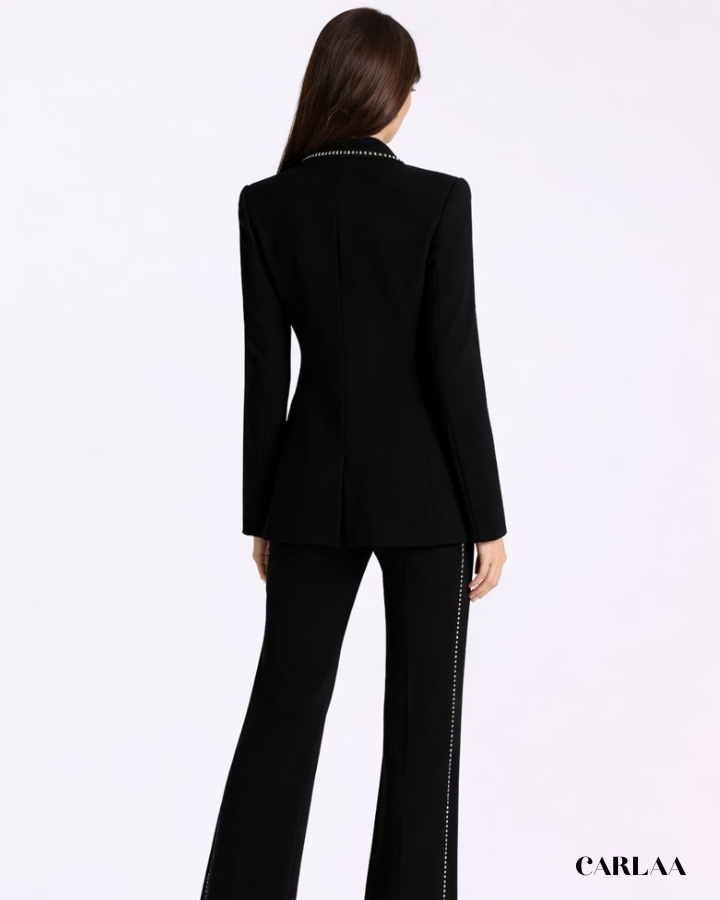 Cette pièce d'exception se distingue par sa veste longue impeccablement structurée, ornée de détails piqués contrastants qui soulignent chaque ligne avec précision. Le col châle apporte une dimension luxueuse tandis que le décolleté plongeant révèle un bandeau assorti créant un jeu de transparence subtilement sensuel. Le pantalon à la coupe droite et fluide s'allonge gracieusement jusqu'au sol, rehaussé par ces mêmes finitions piquées qui créent une harmonie parfaite avec la veste. Cet ensemble CARLAA incarne le pouvoir féminin avec raffinement, parfait pour tes occasions spéciales où tu veux faire sensation. La qualité du tissu et la finition méticuleuse témoignent d'un savoir-faire exceptionnel qui transforme ce tailleur en véritable investissement mode. Ose cette allure résolument chic qui marie avec brio le classique revisité et la modernité audacieuse.