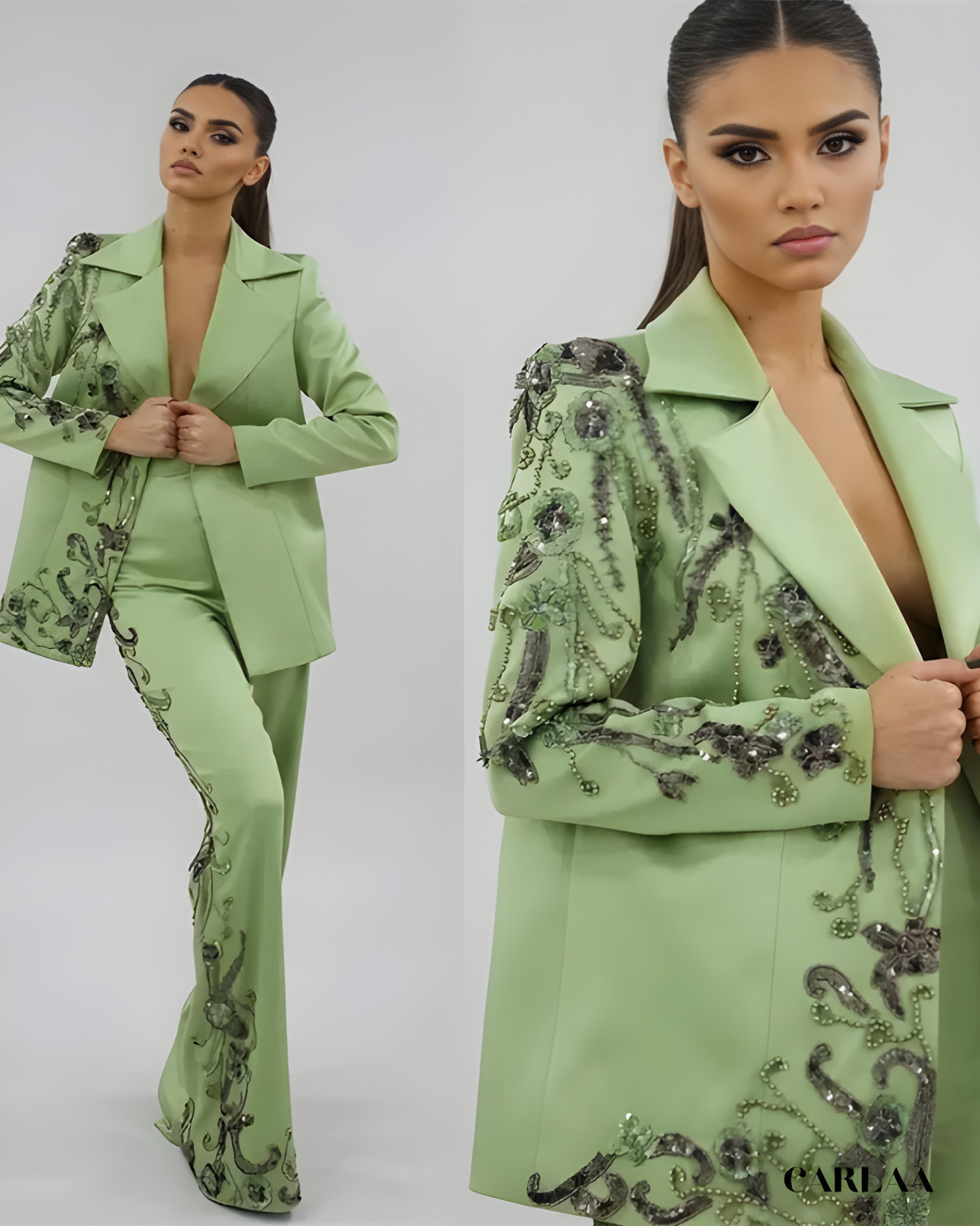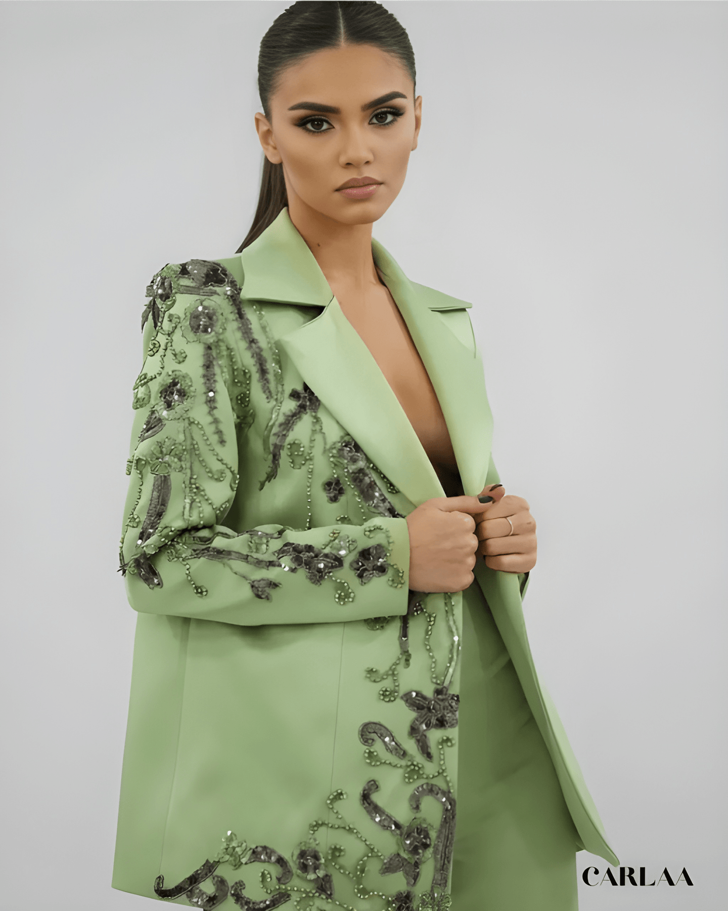 La veste oversize aux broderies de sequins métalliques qui serpentent sur les manches et le long du corps crée un effet visuel hypnotisant qui capte la lumière sous tous les angles. Le col tailleur structuré et le décolleté plongeant affirment ta confiance tout en conservant une élégance irréprochable pour l'occasion. Les broderies florales ornementales appliquées à la main témoignent d'un savoir-faire exceptionnel qui élève cette pièce au rang d'œuvre d'art portable. Le pantalon évasé richement décoré des mêmes motifs scintillants sur les jambes allonge ta silhouette tout en créant une harmonie visuelle parfaite avec la veste. Ce costume vert sauge mariage femme est conçu pour la femme qui refuse la banalité et embrasse son individualité avec fierté lors des grands événements. La coupe impeccable garantit un tombé fluide qui épouse tes formes sans jamais contraindre tes mouvements. Porte cet ensemble remarquable avec des talons hauts minimalistes et des bijoux discrets pour laisser les broderies somptueuses raconter leur propre histoire éblouissante.