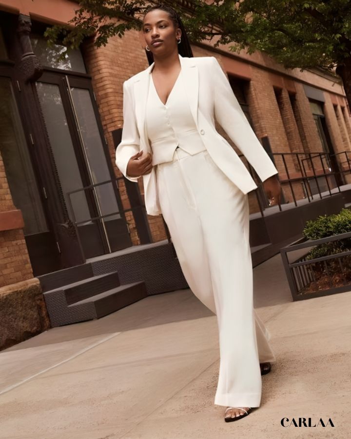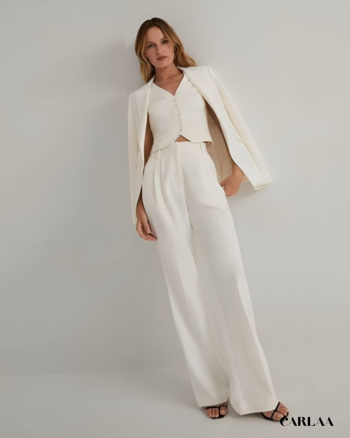 Composé d’un pantalon fluide à taille haute, d’un gilet chic et d’une veste structurée, il sublime la silhouette avec une touche raffinée. Parfait pour une cérémonie, un mariage civil ou un événement professionnel, ce look minimaliste incarne le chic absolu. Associe-le à des talons fins et des bijoux discrets pour un rendu sophistiqué et féminin.