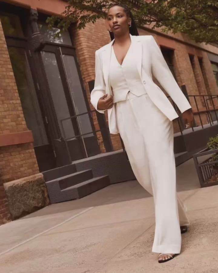 Affirme ton style avec cet ensemble costume blanc pour femme, symbole d’élégance et de confiance.