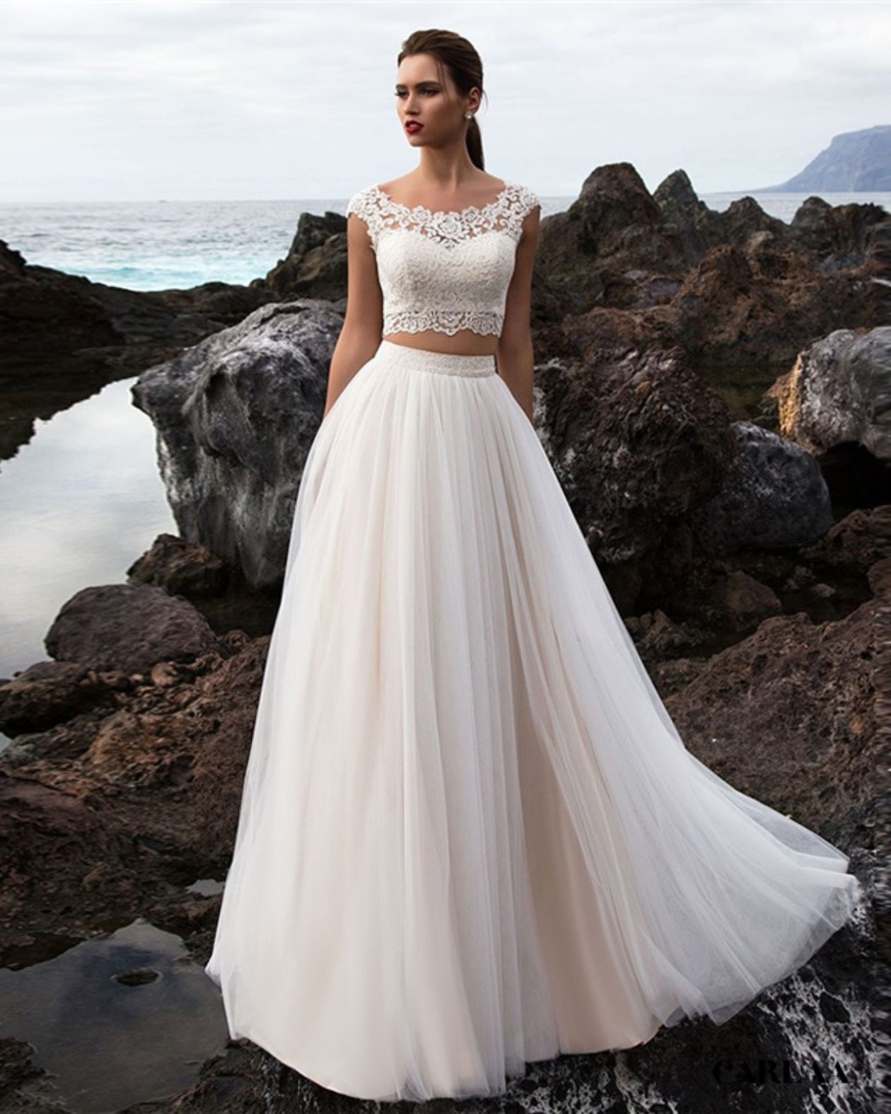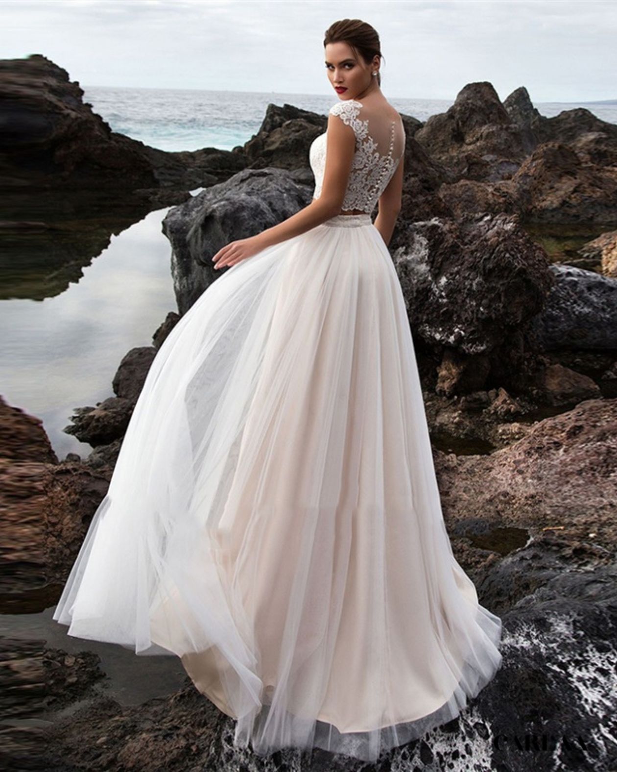 Ce duo sophistiqué se compose d'un crop top raffiné entièrement brodé de dentelle florale délicate avec un décolleté bateau pudique et des manches courtes cap sleeve qui encadrent élégamment tes épaules, créant cette allure romantique et féminine parfaite pour une cérémonie en bord de mer ou dans un jardin luxuriant. La jupe longue en tulle vapoureux superposé tombe en plis souples jusqu'au sol dans un mouvement aérien qui évoque les déesses grecques et crée cette silhouette éthérée absolument captivante lorsque la brise marine joue avec le tissu léger.