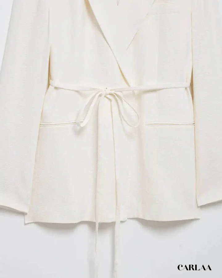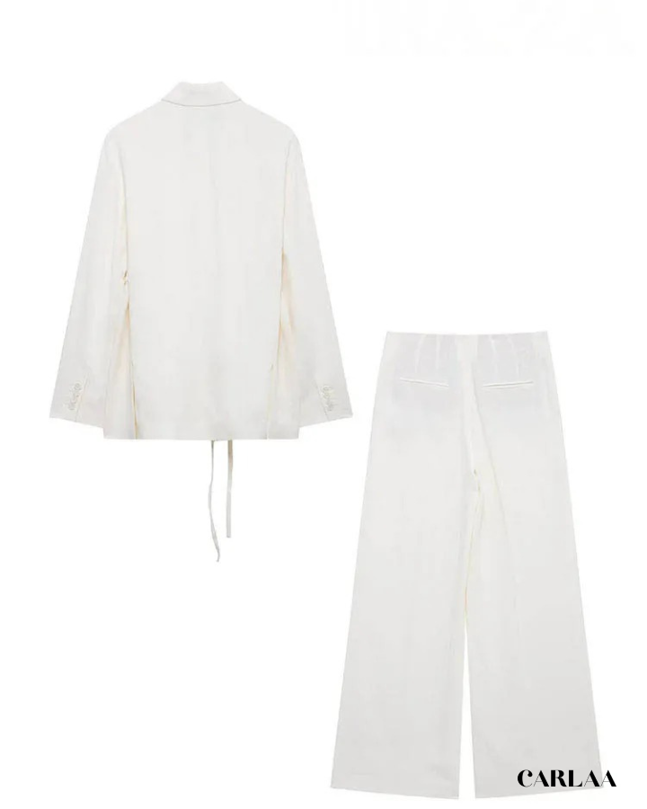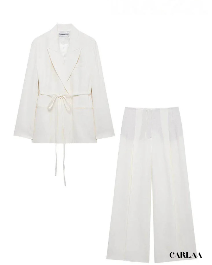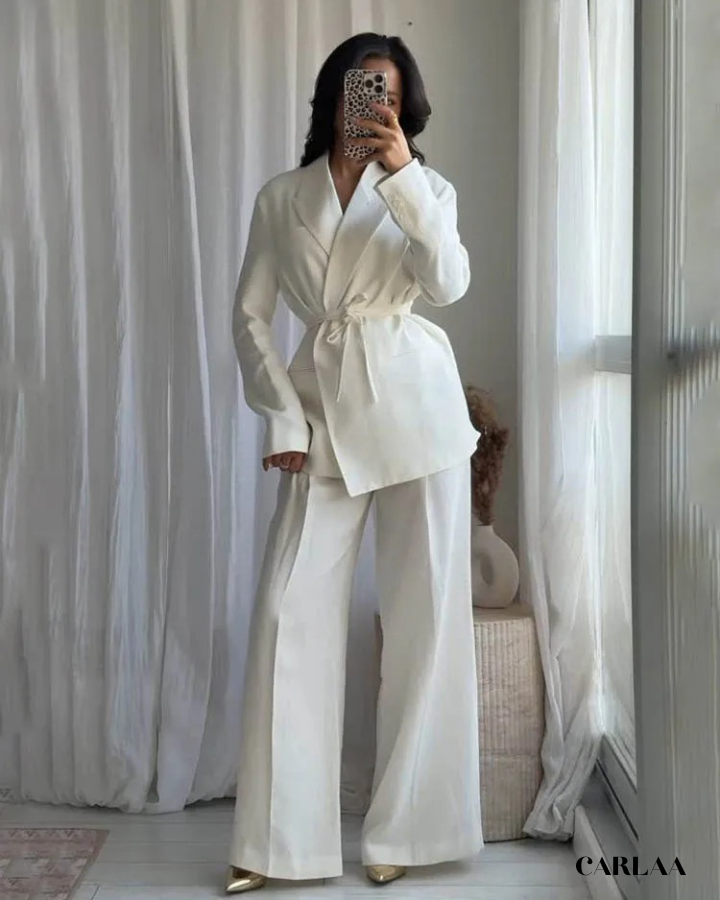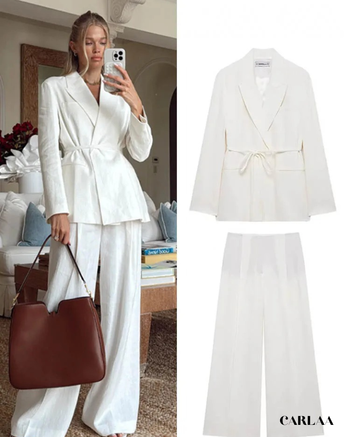 La veste cache-cœur ceinturée crée une silhouette féminine et flatteuse qui met en valeur ta taille tout en offrant une ligne fluide et gracieuse. Le décolleté en V profond apporte cette touche de sensualité maîtrisée qui équilibre parfaitement la rigueur du tailleur classique. La ceinture nouée à la taille te permet d'ajuster la veste selon tes préférences pour un confort optimal tout au long de la journée. Le pantalon palazzo ultra-large tombe avec une majesté spectaculaire qui allonge infiniment tes jambes tout en créant ce mouvement élégant à chaque pas. Cet ensemble tailleur femme blanc classe incarne l'essence même du chic effortless qui caractérise la femme moderne et sophistiquée. Les poches discrètes ajoutent une fonctionnalité pratique sans compromettre l'esthétique épurée de l'ensemble. Accessoirise avec un sac structuré en cuir et des sandales minimalistes pour compléter ce look monochrome qui prouve que la vraie élégance réside dans la simplicité parfaitement exécutée et l'attention méticuleuse portée aux proportions.