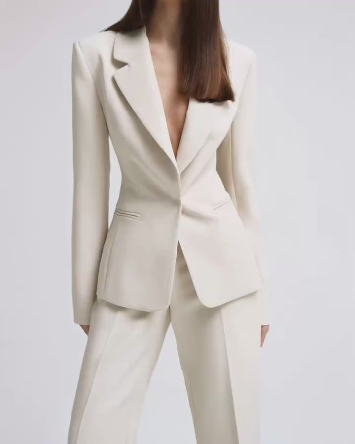La veste structurée, cintrée à la taille, sculpte une silhouette élancée tandis que le pantalon fluide apporte confort et modernité.
