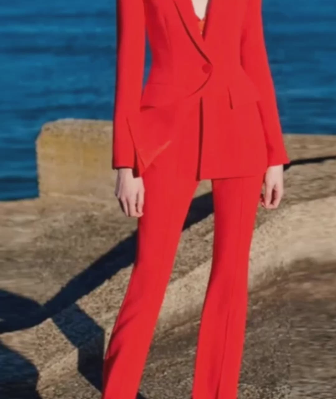 Les manches longues ajustées se terminent par des poignets nets qui allongent visuellement tes bras, et les deux poches plaquées sur les hanches ajoutent une dimension pratique sans compromettre l'esthétique épurée. Le pantalon à jambes droites légèrement évasées crée une ligne verticale qui allonge spectaculairement ta silhouette, avec une coupe haute qui sculpte ta taille et des fentes frontales subtiles qui permettent une démarche fluide et élégante. Style cet ensemble tailleur femme rouge avec des escarpins nude ou noirs à talons hauts, une pochette minimaliste et des bijoux dorés discrets pour laisser la couleur audacieuse parler d'elle-même.
