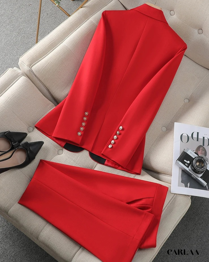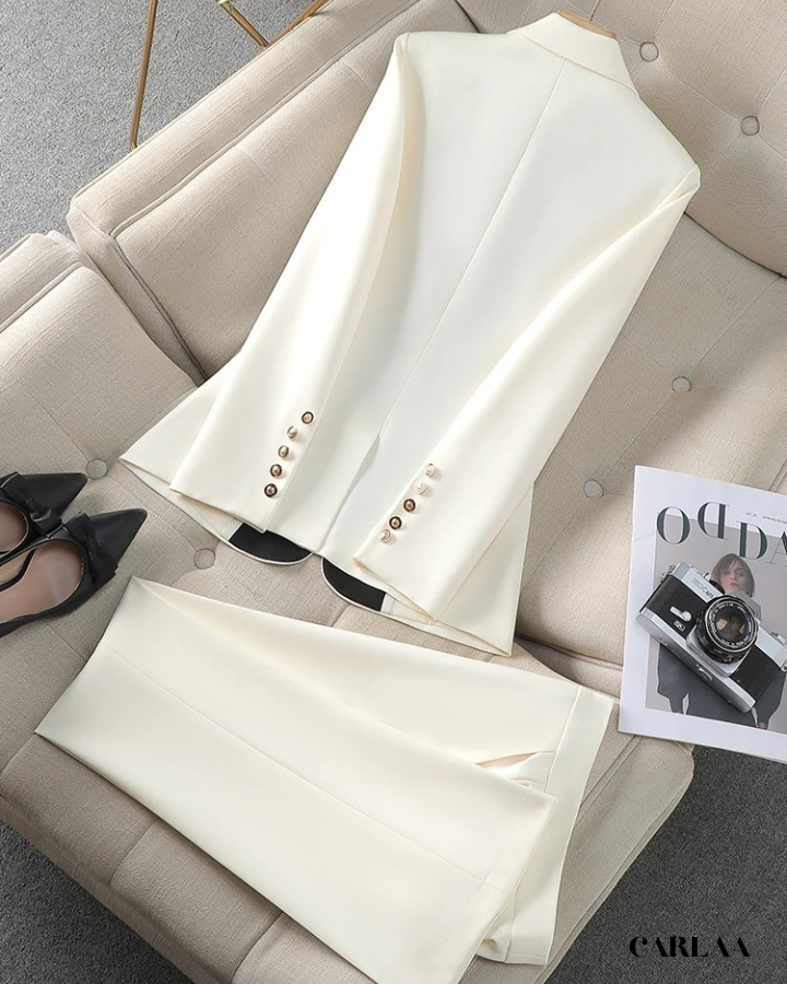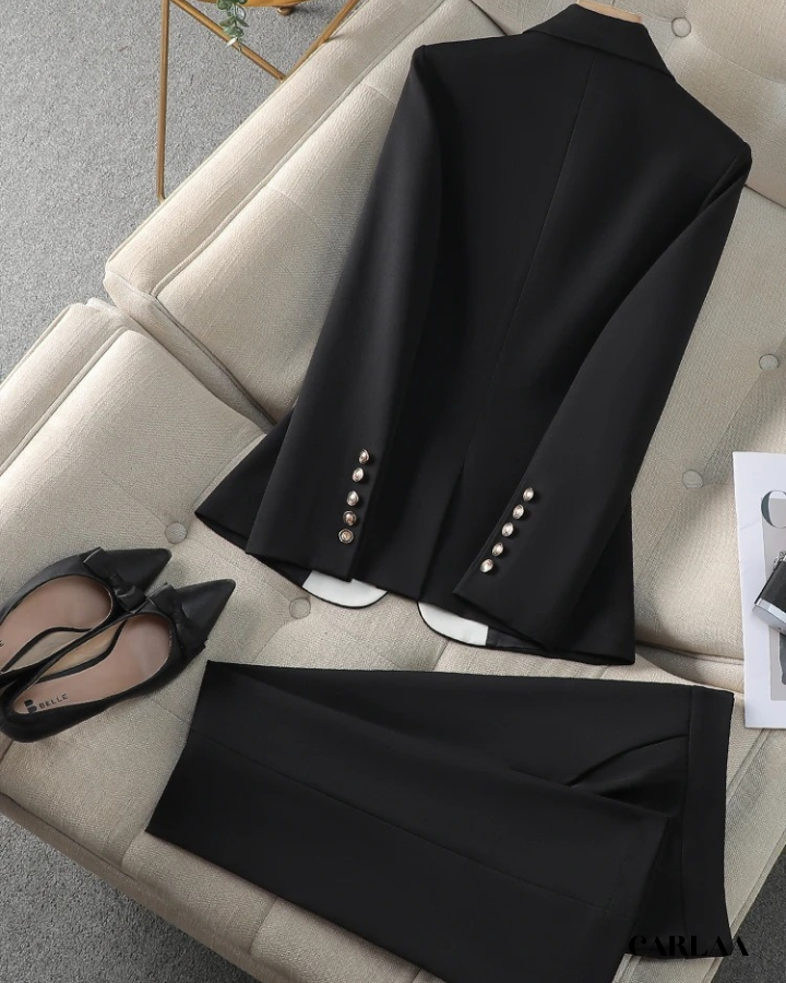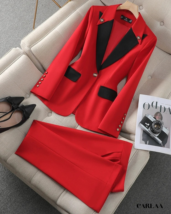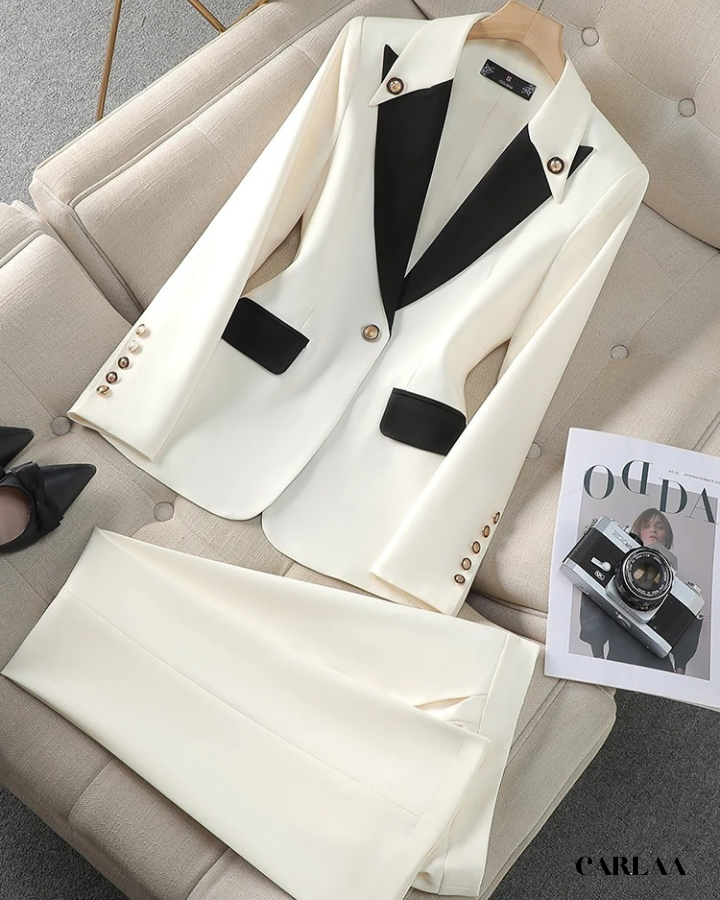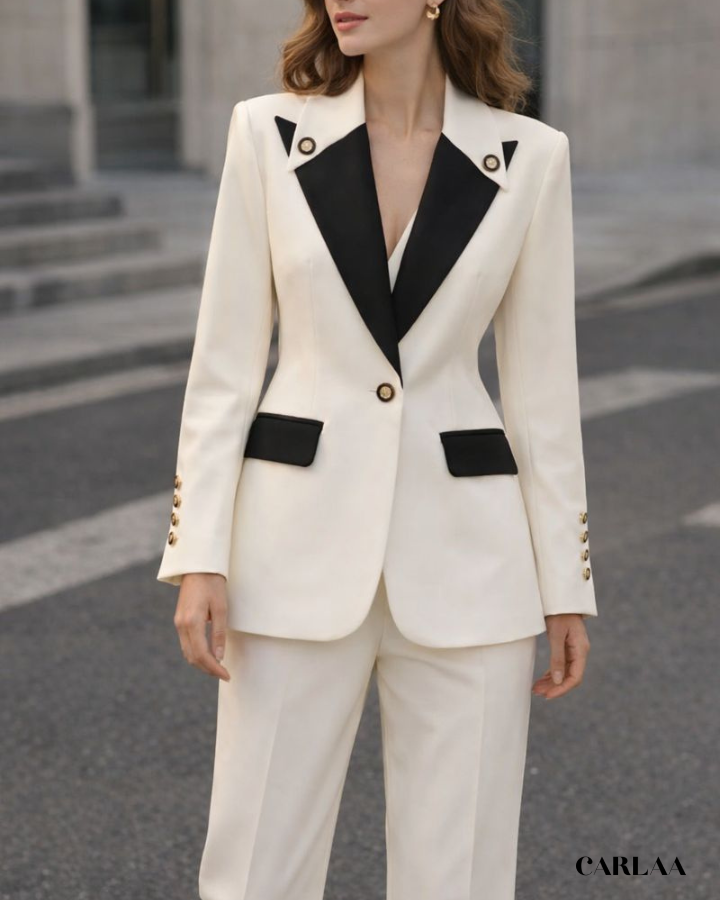 La veste longue aux revers contrastants crée un impact visuel saisissant qui te distingue instantanément de tes collègues lors de toutes tes réunions stratégiques. Les boutons dorés disposés en rangées simples sur la veste et les manches ajoutent cette touche de luxe discret qui témoigne de ton attention aux détails. Les poches plaquées contrastantes apportent une fonctionnalité élégante tout en renforçant l'esthétique graphique de cette pièce statement. La jupe droite coordonnée complète harmonieusement la veste en maintenant cette ligne épurée et professionnelle essentielle au vestiaire corporate. Cet ensemble tailleur femme travail se révèle être ton allié incontournable pour naviguer avec assurance entre présentations importantes, négociations cruciales et événements de networking. La coupe ajustée et la longueur stratégique de la veste allongent ta silhouette tout en créant une allure d'autorité naturelle. Porte cet ensemble percutant avec des escarpins élégants et des accessoires minimalistes pour incarner cette professionnelle accomplie qui gravit les échelons avec style et détermination.