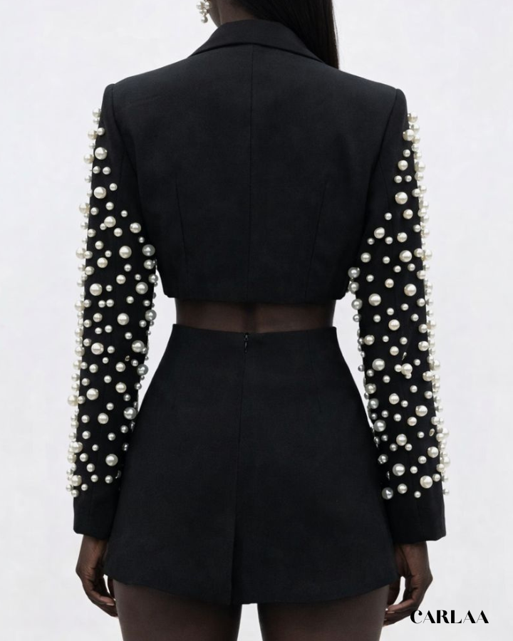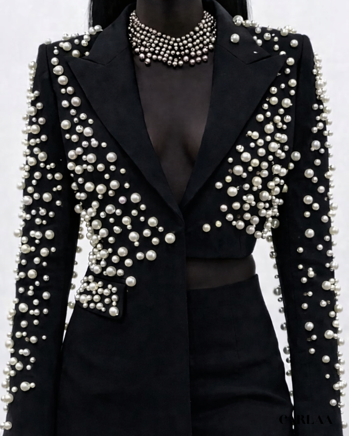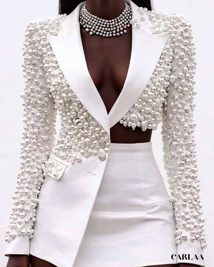 La veste extraordinaire entièrement recouverte de perles nacrées crée un effet tridimensionnel fascinant qui capte la lumière sous tous les angles pour un résultat visuellement époustouflant. Les manches généreusement ornées de ces perles précieuses ajoutent une dimension luxueuse qui témoigne d'un artisanat exceptionnel et d'une attention méticuleuse aux détails. Le contraste saisissant entre les manches perlées et le corps immaculé de la veste crée une harmonie visuelle qui attire instantanément l'attention tout en maintenant une sophistication irréprochable. La jupe courte ajustée complète parfaitement cette veste statement en apportant une touche de modernité audacieuse à cet ensemble festif. Cet ensemble tailleur jupe femme mariage est conçu pour la femme qui refuse la banalité et embrasse son individualité lors des grandes célébrations. Le décolleté plongeant en V permet de mettre en valeur un collier de perles assorti qui complète harmonieusement l'esthétique luxueuse de la tenue. Porte cette pièce d'exception avec des escarpins raffinés et deviens l'invitée dont tout le monde se souviendra longtemps après la fin des festivités.