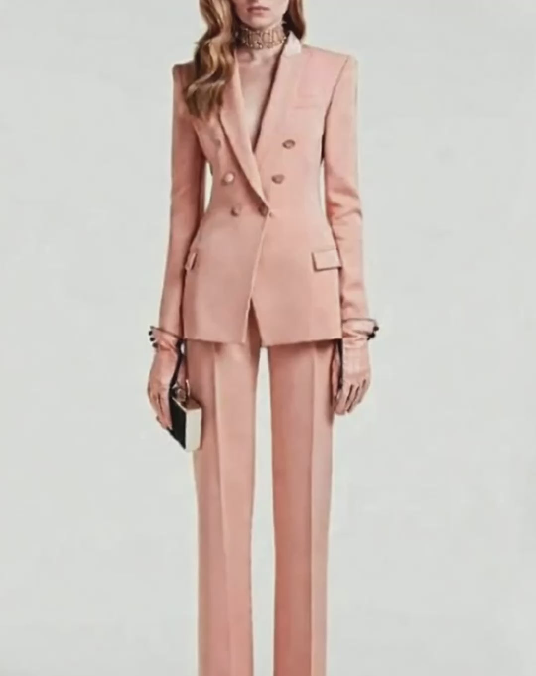 La veste structurée flatte la silhouette avec ses lignes nettes et ses boutons subtils qui apportent une touche d'élégance. Le pantalon, à la fois chic et confortable, s'accorde parfaitement avec la veste pour un ensemble harmonieux et puissant, adapté à toutes les occasions formelles ou réunions importantes.