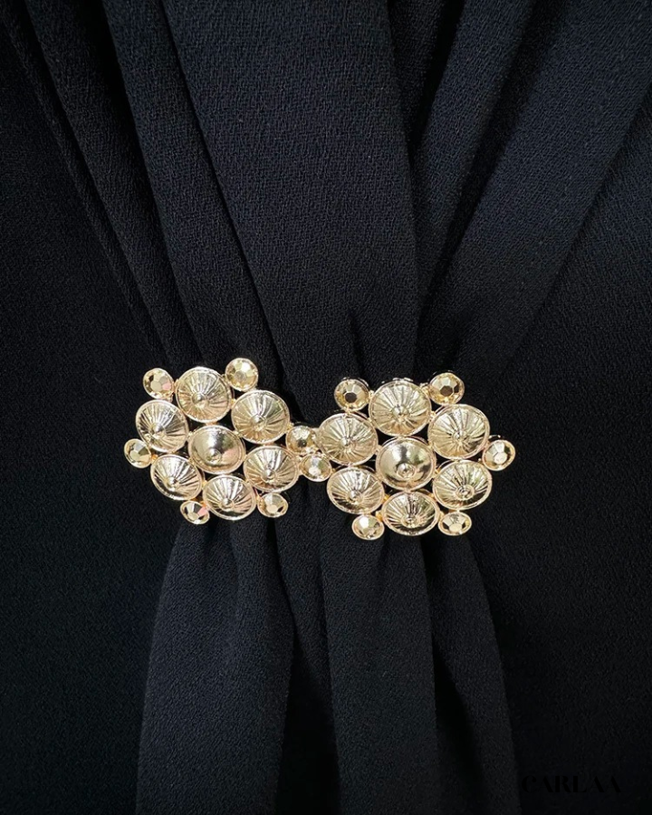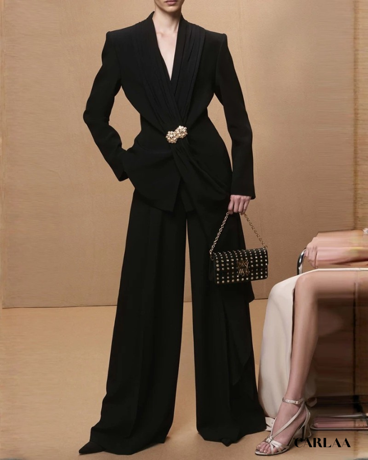 La veste sculptante présente une coupe ajustée qui sublime ta silhouette, avec un décolleté plongeant rehaussé d'une broche ornementale dorée qui apporte cette touche de luxe instantanément reconnaissable. Les épaulettes structurées affirment ton caractère tandis que la ceinture intégrée marque délicatement ta taille pour un effet ultra-flatteur. Le pantalon large à coupe palazzo crée une allure fluide et majestueuse qui allonge ta silhouette tout en offrant un confort absolu pour toutes tes journées chargées. Cette pièce maîtresse transcende les tendances passagères pour devenir l'investissement mode incontournable de ta garde-robe professionnelle. Que tu te rendes à une réunion stratégique, un événement prestigieux ou un dîner d'affaires, cet ensemble tailleur pantalon te garantit une présence remarquée et une assurance décuplée. Associe-le à des accessoires dorés et des escarpins raffinés pour parfaire ce look d'exception qui ne passera jamais inaperçu.