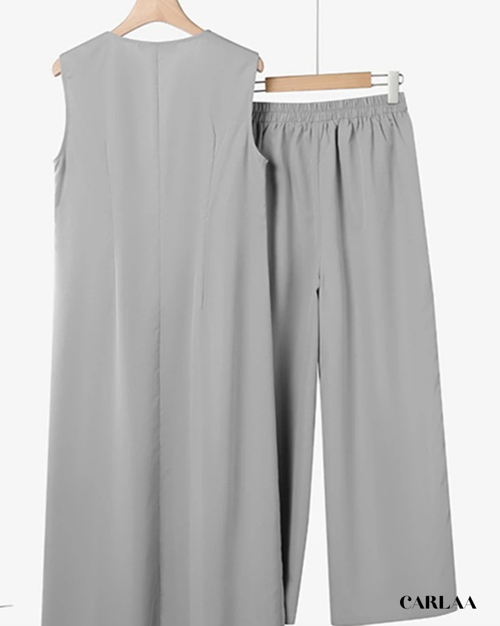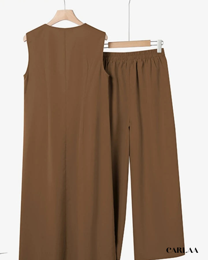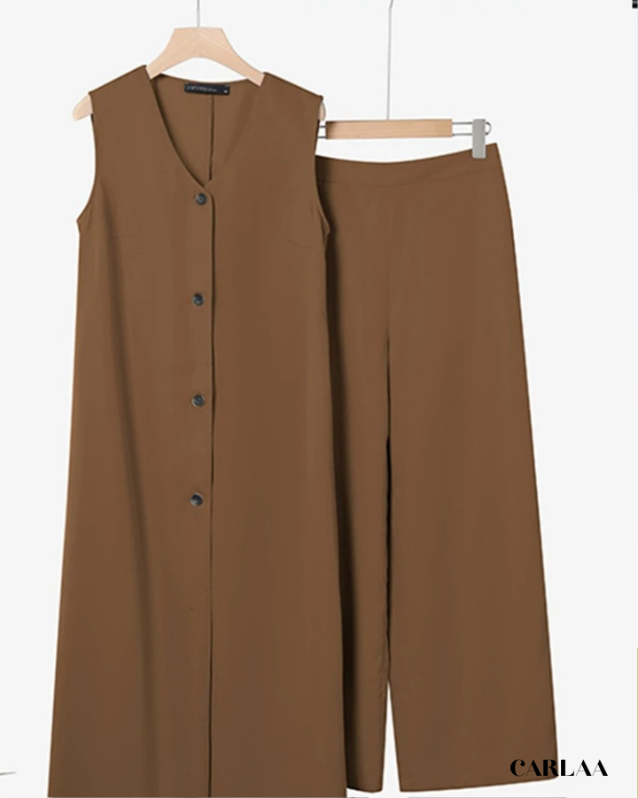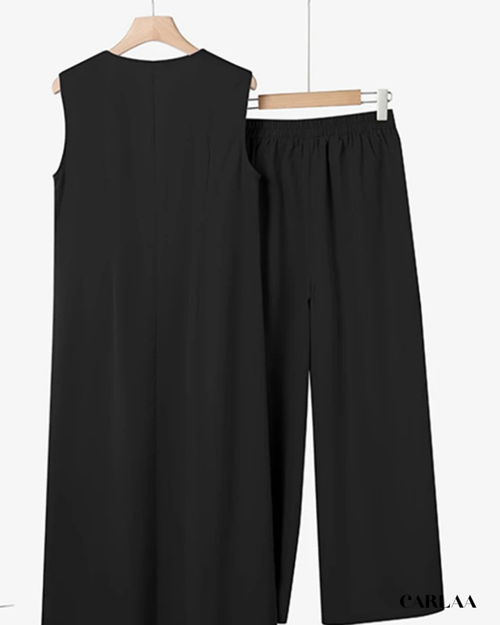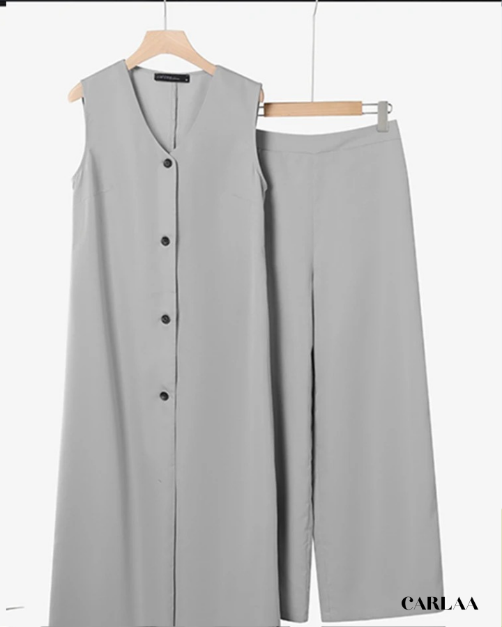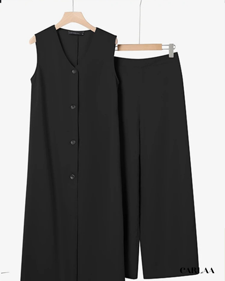 Affirme ton style professionnel avec cet ensemble tailleur sans manches femme qui réinvente le dress code corporatif avec une modernité raffinée et sophistiquée. Le gilet long sans manches au décolleté en V sculpte élégamment ta silhouette tandis que la rangée de boutons asymétrique apporte ce détail original qui te distingue. La coupe ajustée épouse tes courbes avec précision tout en conservant cette allure professionnelle impeccable et appropriée. Le pantalon palazzo à jambe ultra-large allonge majestueusement ta silhouette avec cette fluidité aérienne signature du chic contemporain. Cette tenue polyvalente incarne le parfait équilibre entre professionnalisme rigoureux et modernité assumée, idéale pour tes journées au bureau, réunions importantes ou événements d'affaires. Les poches discrètes intégrées ajoutent cette fonctionnalité pratique indispensable au quotidien professionnel. Le tissu de qualité supérieure garantit confort absolu et tenue impeccable du matin au soir. Investis dans cet ensemble intemporel qui célèbre la femme professionnelle moderne, confiante et élégante, capable de naviguer avec aisance entre réunions stratégiques et événements networking avec classe, sophistication et assurance professionnelle absolue.