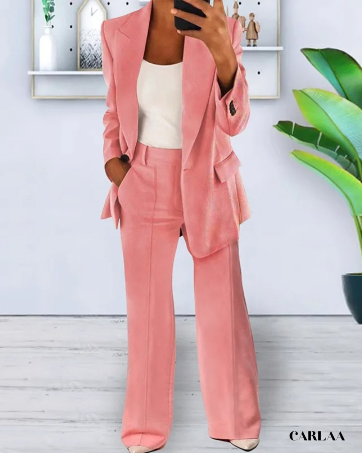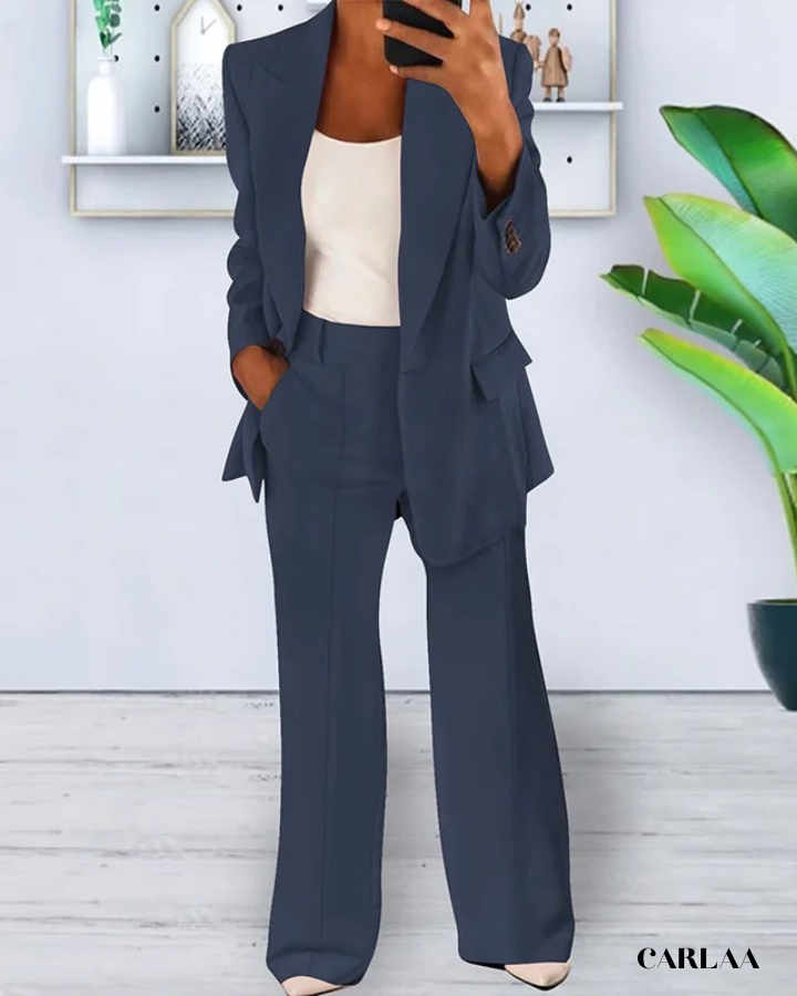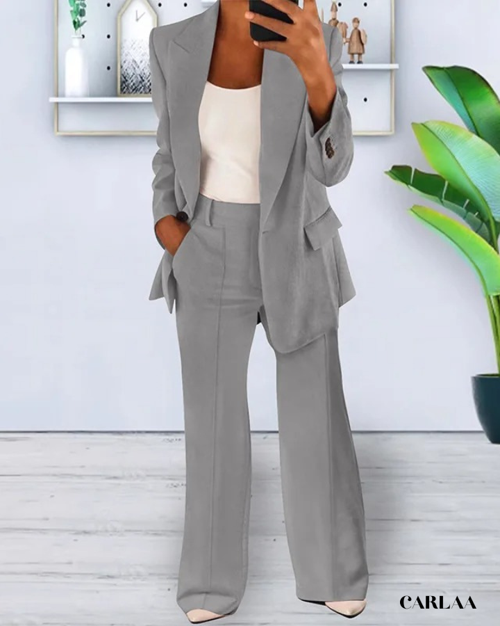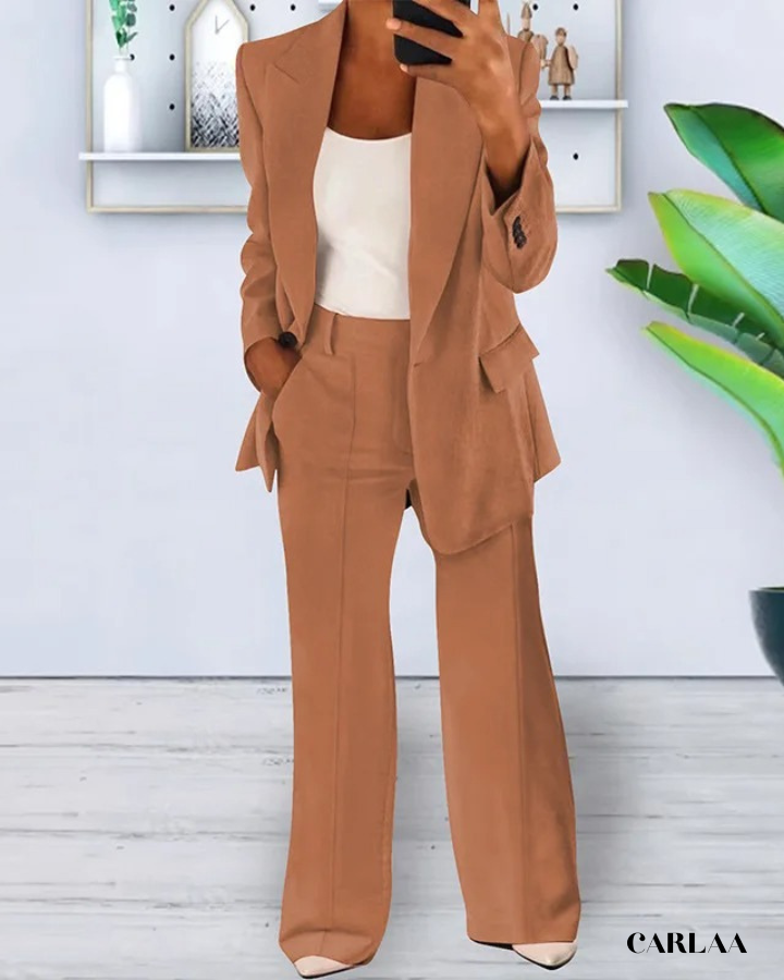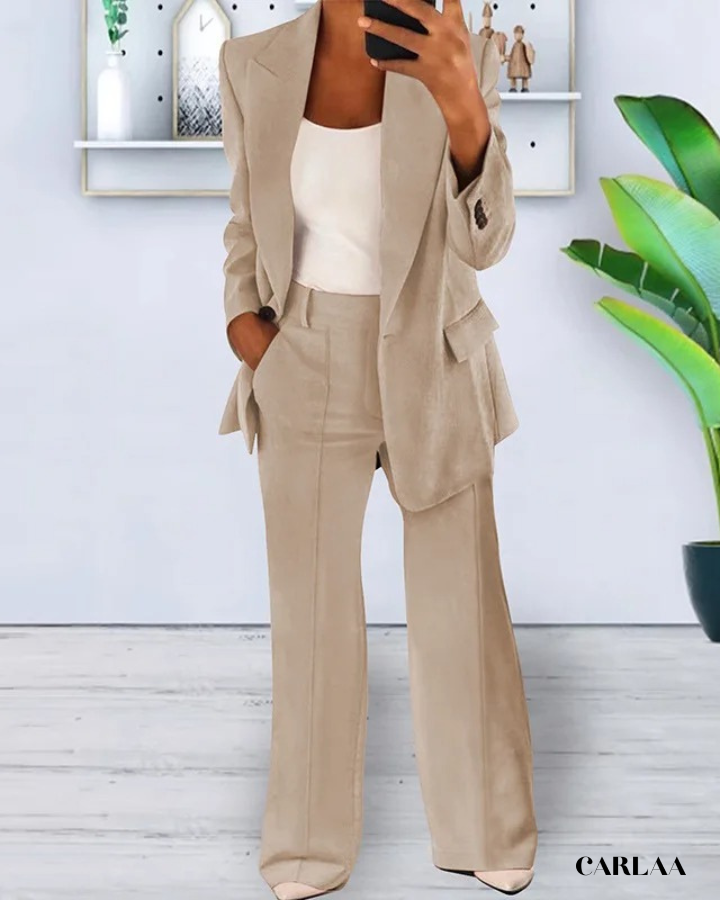 La veste ajustée aux revers structurés crée une silhouette affirmée qui inspire instantanément confiance et respect lors de tes réunions stratégiques. Les poches plaquées apportent une fonctionnalité discrète tout en maintenant l'esthétique épurée et professionnelle que tu recherches pour ton quotidien. Le pantalon droit à jambes légèrement évasées allonge ta silhouette tout en offrant un confort optimal pour naviguer entre ton bureau, tes rendez-vous clients et tes présentations importantes. Cet ensemble tenue professionnelle femme se distingue par sa coupe impeccable qui reste flatteuse du matin jusqu'au networking d'après-travail. La veste sans bouton apparent maintient une ligne élégante et moderne qui se marie parfaitement avec le débardeur uni pour créer un look sophistiqué sans effort. Les coutures soignées et le tombé parfait du tissu témoignent d'une qualité supérieure qui résiste à l'épreuve du temps et des journées chargées. Porte cet ensemble avec des escarpins pointus et des accessoires minimalistes pour incarner cette femme d'affaires accomplie qui maîtrise l'art du style professionnel avec brio.