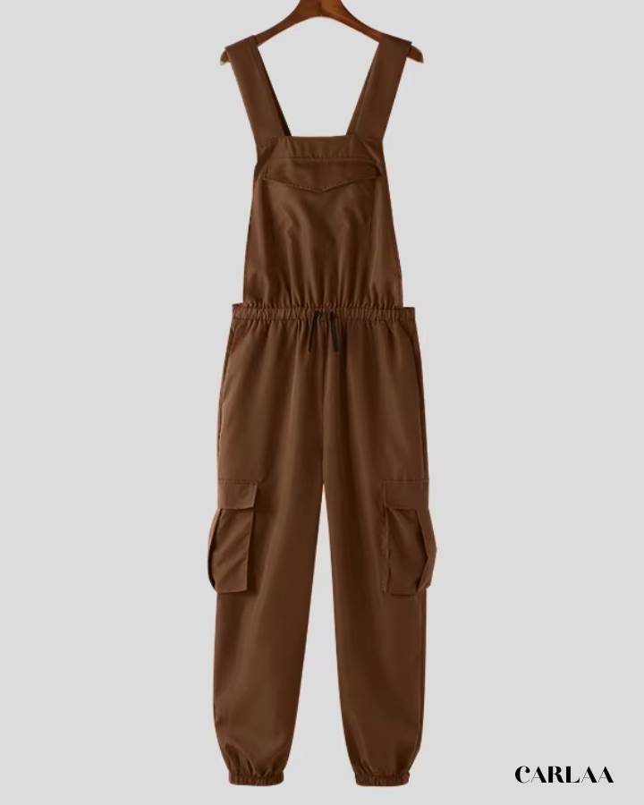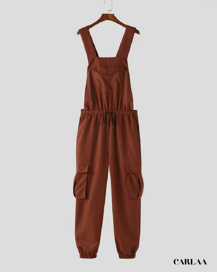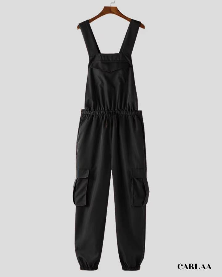 Sa coupe pratique avec taille élastiquée et cordon ajustable assure une tenue confortable, tandis que les poches cargo ajoutent une touche utilitaire et tendance. Les bretelles larges et la coupe ample mettent en valeur ton physique tout en restant décontractées.