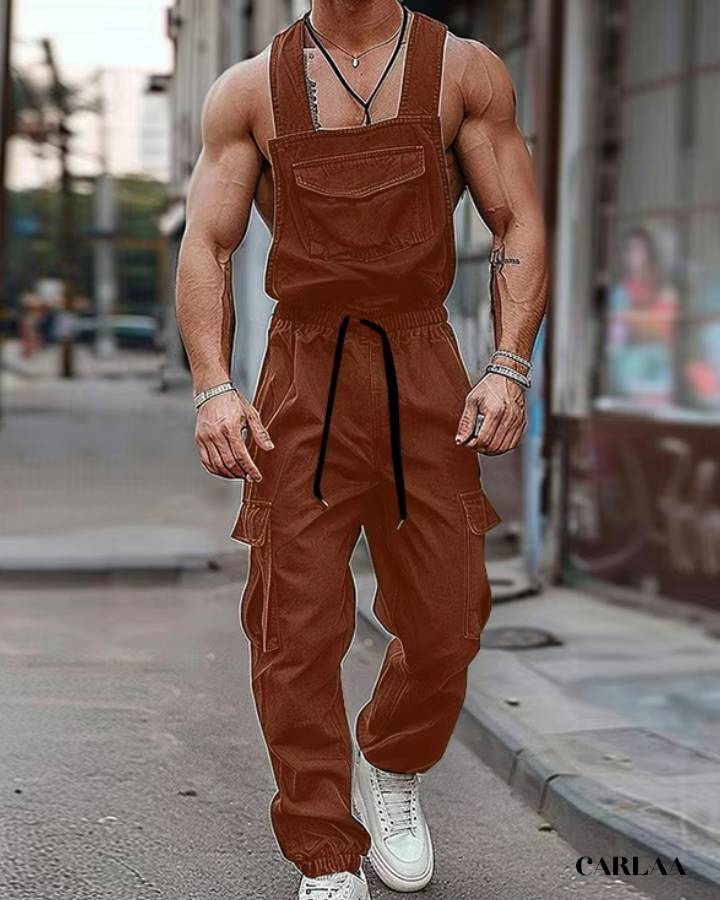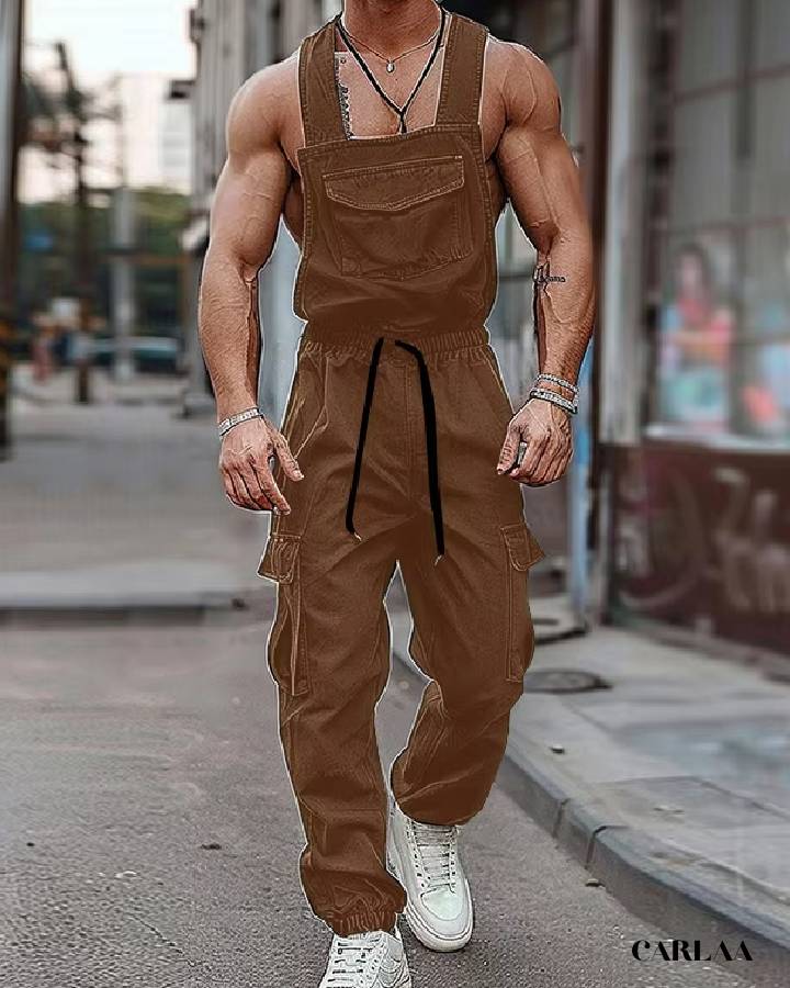Parfaite pour un look urbain affirmé, cette jumpsuit homme se porte avec des baskets blanches et quelques accessoires pour un style casual et charismatique.
