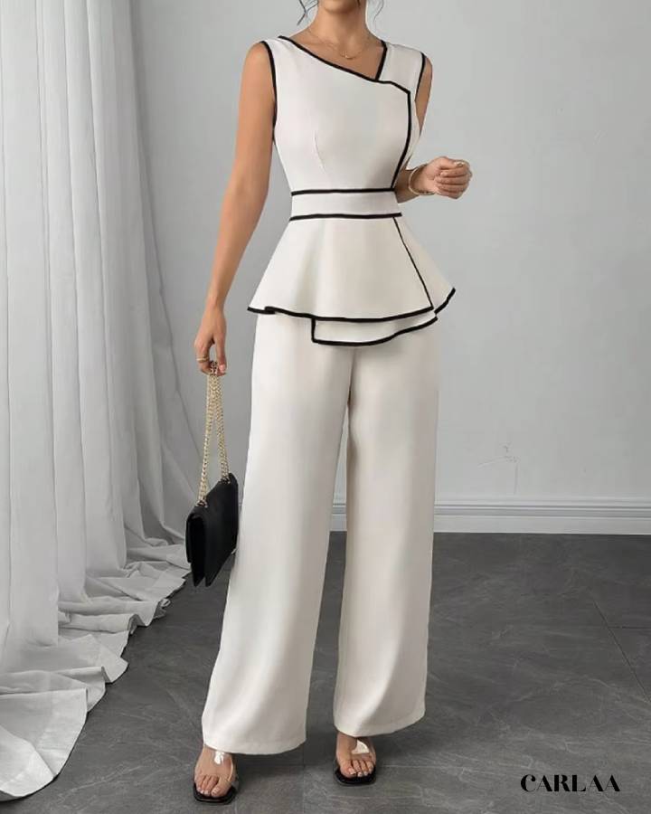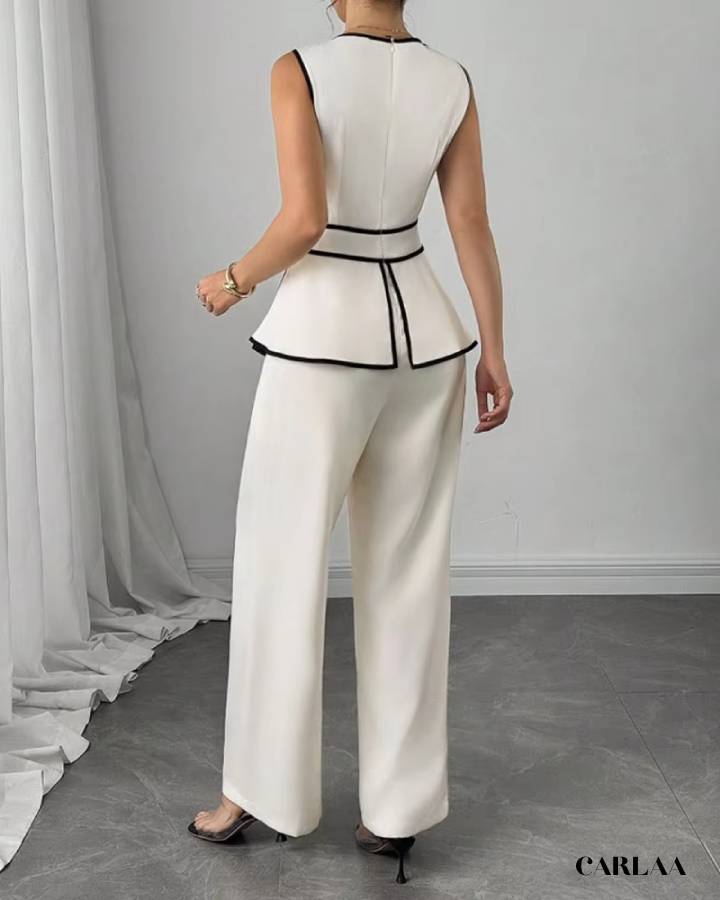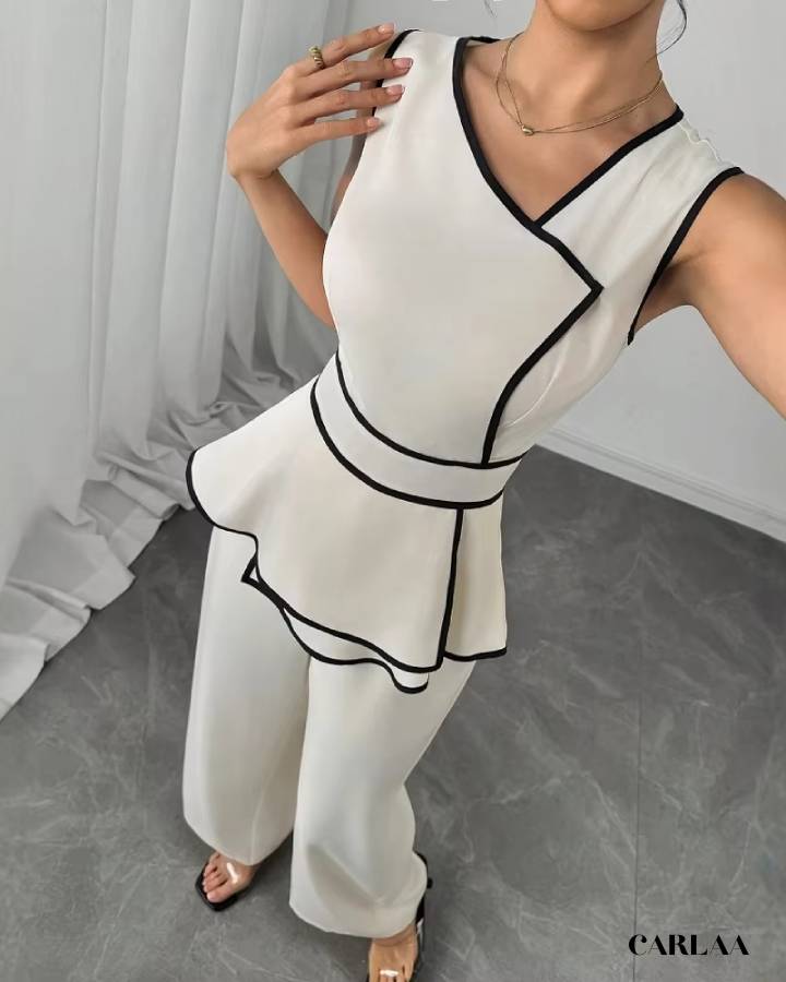 Son haut sans manches au design structuré, souligné par de fines bordures noires, met en valeur ta silhouette avec sophistication. La coupe peplum marque joliment la taille, tandis que le pantalon fluide apporte confort et allure élancée.