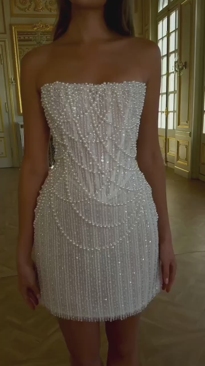 Chaque perle a été minutieusement placée pour créer un jeu de lumière raffiné qui capte le regard sans jamais en faire trop. Sa coupe bustier souligne délicatement la silhouette, tandis que le laçage au dos ajoute une touche de caractère et de maintien.