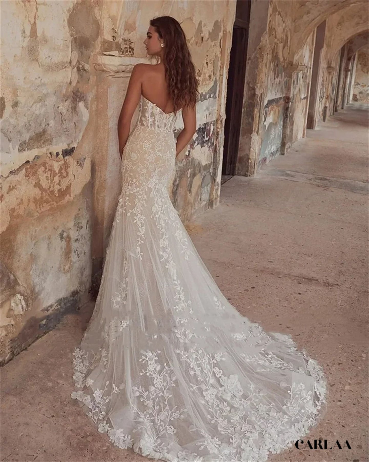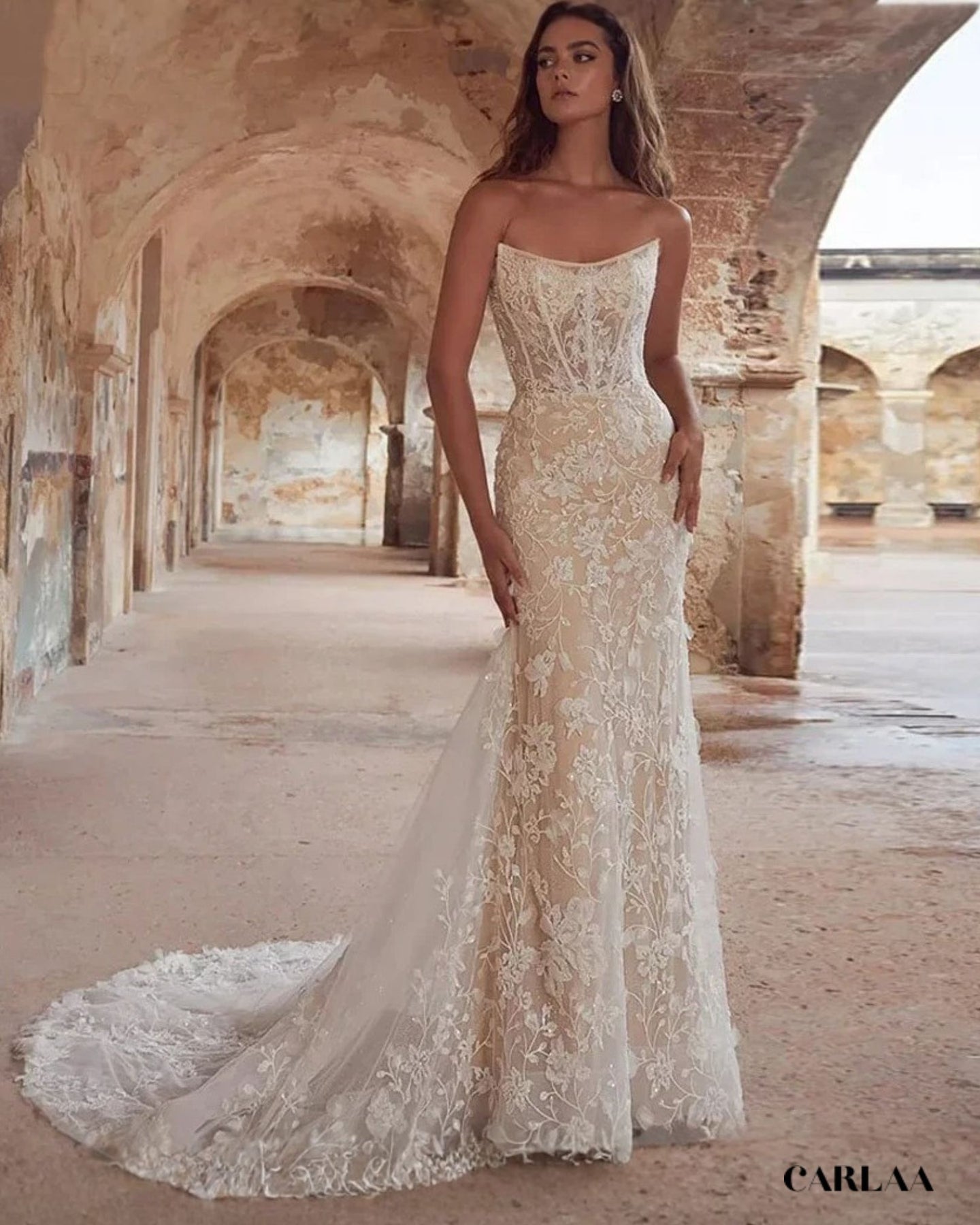 Succombe à la beauté de cette robe de mariage civil en dentelle, une pièce qui sublime ta silhouette avec grâce et raffinement. Son bustier structuré, sans bretelles, met en valeur le décolleté et la taille, tandis que la coupe sirène épouse tes courbes avant de s’ouvrir sur une traîne légère et délicatement brodée. La dentelle florale, subtilement posée sur un tissu nude, crée un effet seconde peau irrésistible et sophistiqué. Parfaite pour une cérémonie intime ou un mariage élégant, cette robe incarne le romantisme moderne. Elle allie sensualité et douceur, avec ses détails brodés, sa transparence raffinée et sa légèreté. Si tu rêves d’une allure à la fois féminine, gracieuse et inoubliable, cette robe est faite pour toi.