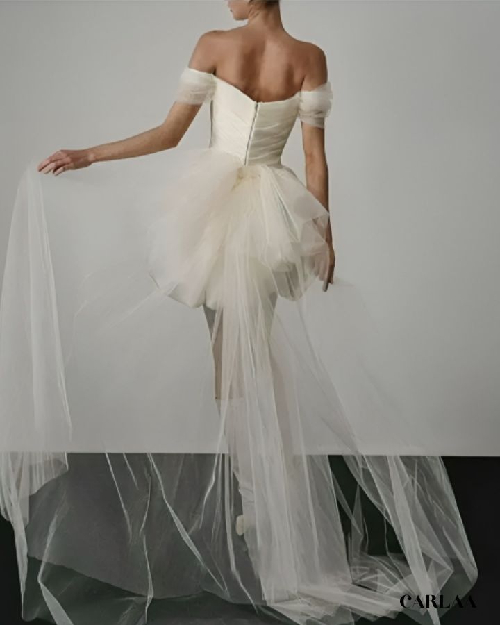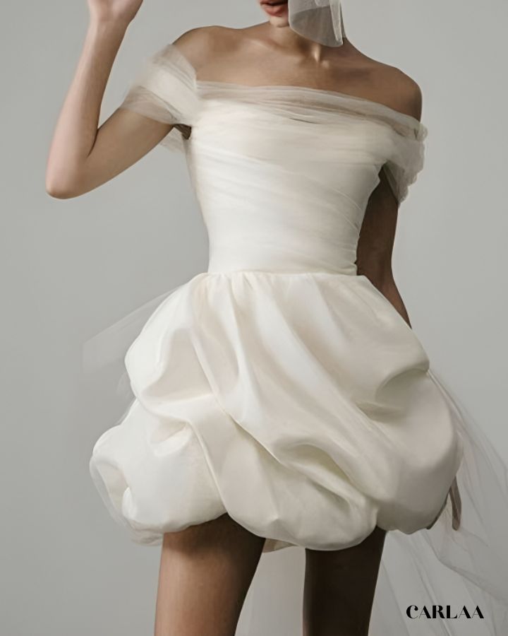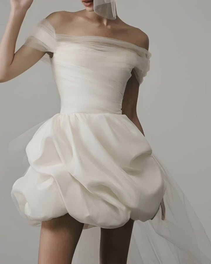 Son bustier drapé met subtilement en valeur les épaules et le décolleté, tandis que la jupe bouffante façon “haute couture” apporte volume et légèreté. Confectionnée dans un tulle aérien et une matière satinée au tombé parfait, cette pièce unique incarne l’élégance sophistiquée d’un mariage civil ou d’une réception chic.
