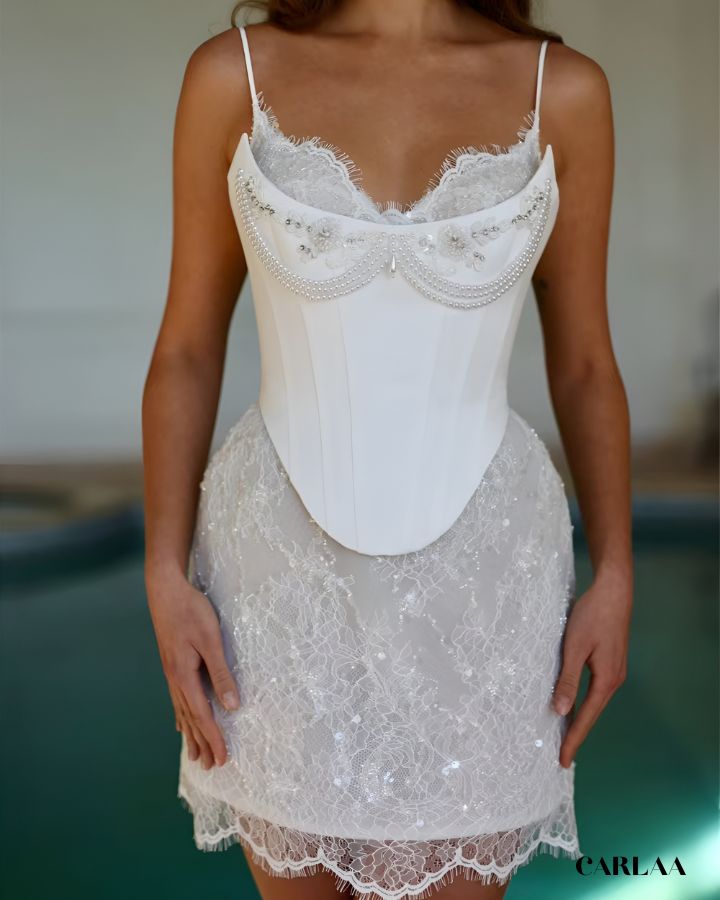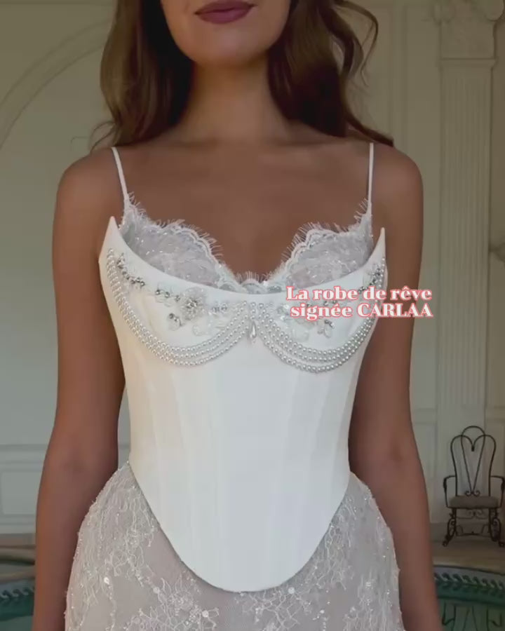 Son corset structuré met en valeur la silhouette, tandis que la jupe en dentelle délicate ornée de sequins apporte une touche de brillance subtile. Idéale pour la mariée moderne, cette tenue allie romantisme et élégance pour dire « oui » avec style.