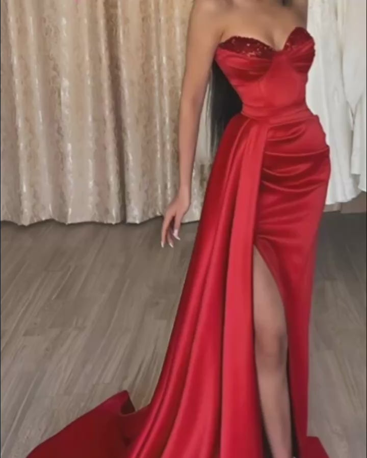 Arborant un corsage orné de paillettes captivantes, elle présente une coupe bustier qui met en valeur le décolleté avec élégance et sophistication. La taille est marquée par des drapés délicats qui soulignent la silhouette, tandis que la fente audacieuse sur le côté offre un aperçu de tes jambes, ajoutant une touche de glamour indéniable.