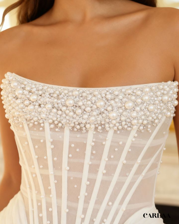 Son corset bustier orné de perles met en valeur la silhouette, tandis que le drapé asymétrique en tulle apporte une touche moderne et aérienne. Le laçage au dos sublime la taille et assure un ajustement parfait.
