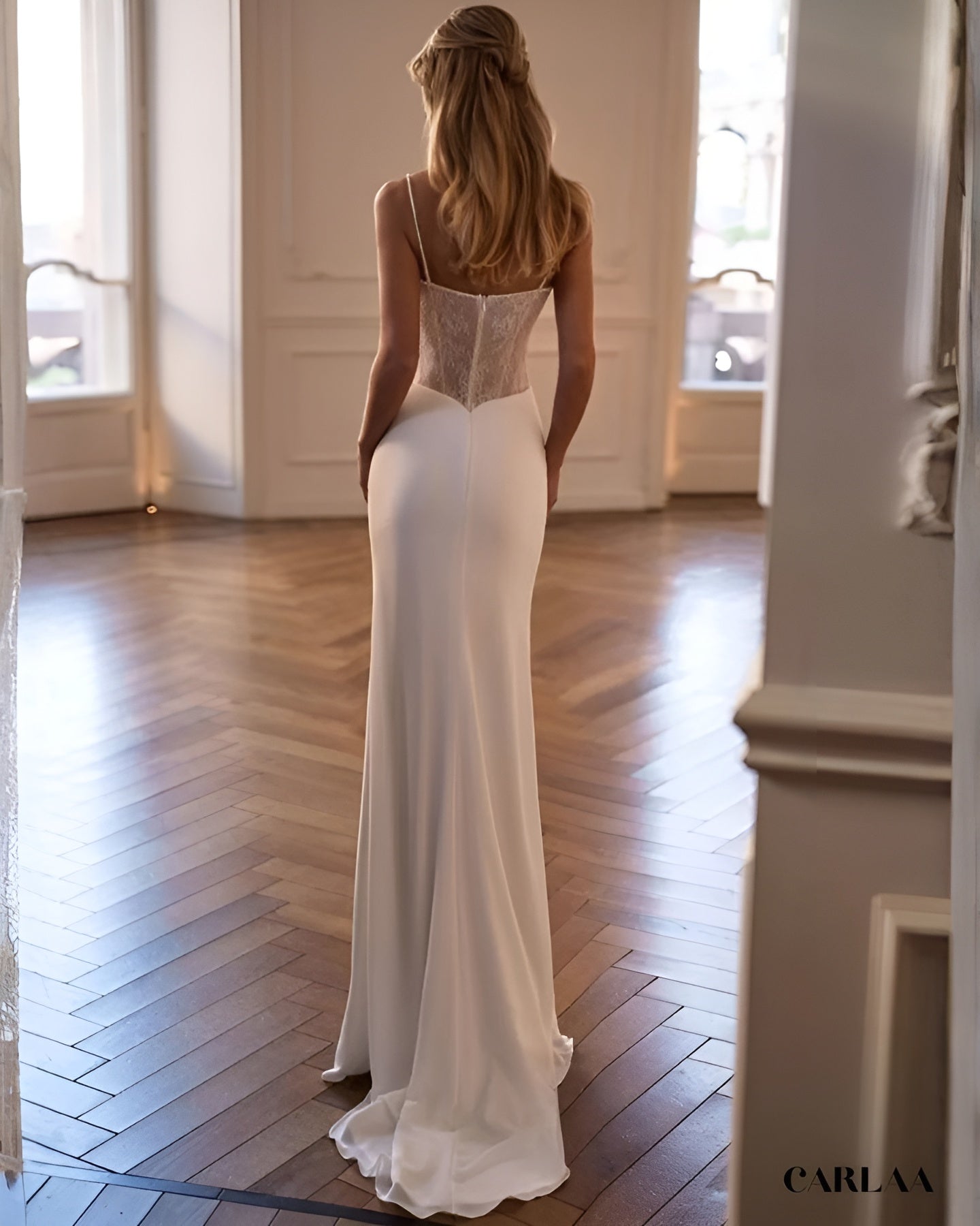 Le bustier corseté à fines bretelles spaghetti sculpte délicatement ton décolleté en cœur tandis que la dentelle florale brodée crée un effet précieux et raffiné. La construction corsetée du buste assure un maintien parfait tout en mettant en valeur tes courbes avec une élégance absolue. La jupe longue drapée asymétriquement épouse ta silhouette avant de révéler une fente latérale audacieuse qui apporte cette dimension moderne et sexy. Le contraste entre le buste structuré en dentelle et la jupe fluide en satin crée une harmonie visuelle captivante qui sublime ta féminité. Le collier ornemental perlé complète à merveille cette allure de déesse moderne, ajoutant cette touche de sophistication luxueuse. Cette création exceptionnelle marie avec brio le romantisme délicat et la sensualité assumée, parfaite pour un mariage civil élégant ou une cérémonie intimiste chic. Offre-toi cette robe d'exception qui célèbre ta beauté naturelle avec grâce, audace et une élégance intemporelle qui te fera rayonner lors de ton jour unique.