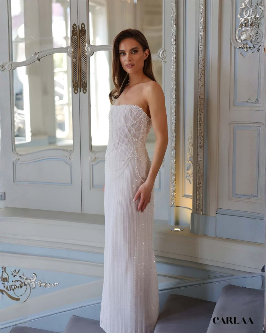Cette création couture exceptionnelle célèbre ta silhouette avec des milliers de perles délicatement brodées en lignes verticales qui créent un effet amincissant et sculptural absolument saisissant. Le bustier droit sans bretelles structure élégamment ton décolleté tout en offrant un maintien parfait grâce à sa construction corsetée invisible qui épouse tes courbes avec précision. Le laçage ajustable au dos garantit un ajustement personnalisé à ta morphologie tout en créant ce détail romantique qui sublime ta silhouette vue de dos. La coupe fourreau étroite épouse sensuellement tes formes avant de s'évaser légèrement vers le bas pour faciliter ta marche avec une grâce naturelle.