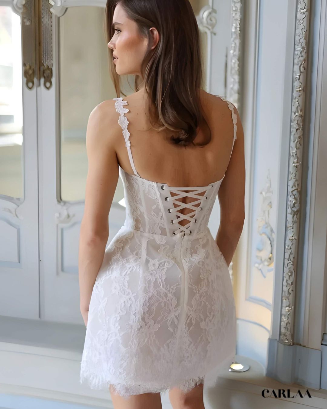 Succombe au charme irrésistible de cette robe de mariée courte élégante qui célèbre ta féminité avec une sophistication absolument captivante. Cette création exceptionnelle entièrement brodée de dentelle délicate révèle un savoir-faire artisanal remarquable où chaque motif floral raconte une histoire de romantisme intemporel. Le bustier structuré aux bretelles fines ornées de dentelle sublime ton décolleté avec une sensualité raffinée tandis que le détail joaillerie au centre ajoute une touche de luxe précieux. Le dos spectaculaire avec son laçage corset ajustable garantit un ajustement parfait à ta morphologie tout en créant un détail visuel absolument saisissant qui fera tourner les têtes.