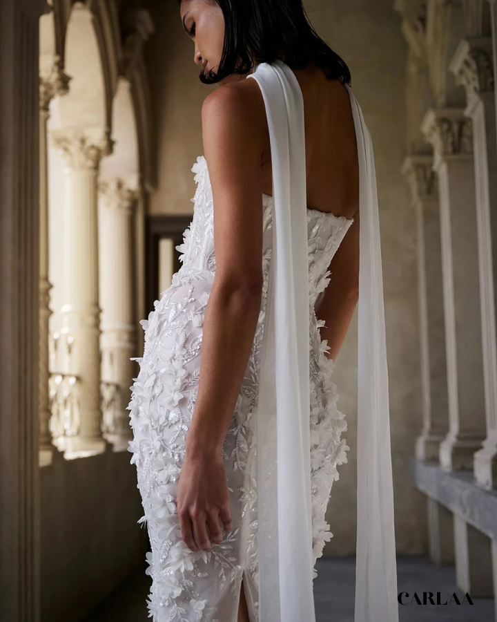 Cette création couture exceptionnelle célèbre la nature avec des centaines d'appliqués floraux tridimensionnels délicatement brodés à la main qui créent un relief textile absolument spectaculaire. Le bustier droit sans bretelles structure élégamment ton décolleté tout en mettant en valeur tes épaules avec une sophistication épurée et moderne. Le col montant détachable en satin ajoute une dimension architecturale audacieuse qui contraste magnifiquement avec la douceur romantique des motifs floraux. Les fleurs de dentelle en relief cascadent organiquement sur toute la silhouette fourreau et créent ce mouvement naturel qui semble capturé en pleine floraison.