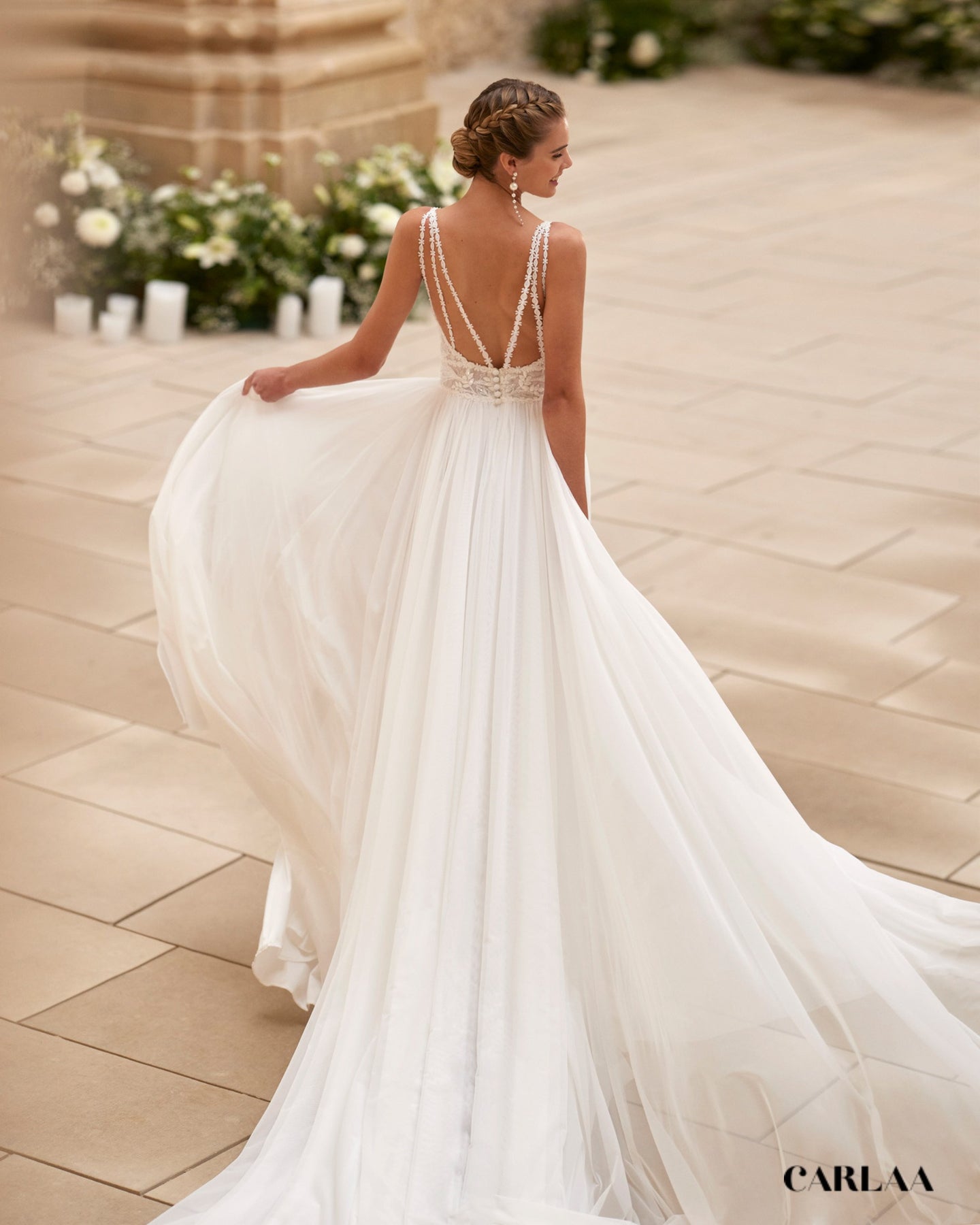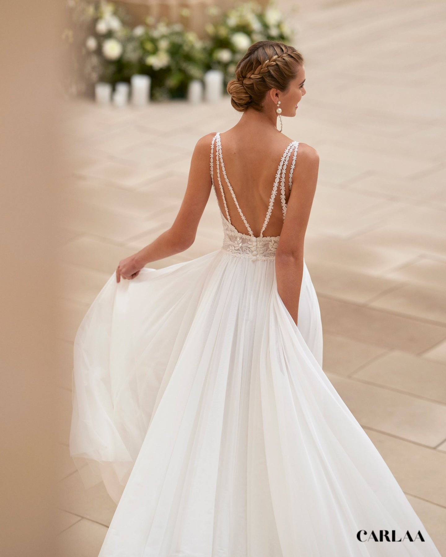 Laisse-toi séduire par cette robe de mariage civil d’une grâce absolue. Son corsage délicatement brodé épouse la silhouette avec légèreté, tandis que son dos nu apporte une touche sensuelle et subtile. La jupe fluide, fendue sur le côté, crée un mouvement aérien à chacun de tes pas, parfaite pour une cérémonie intime ou un mariage en plein air. Cette robe allie élégance et confort, pour que tu rayonnes avec aisance tout au long de cette journée unique. Sa coupe intemporelle et sa matière légère sublimeront ta beauté naturelle — une pièce faite pour la mariée moderne, confiante et résolument chic. 💍✨