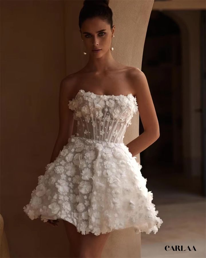 Son corset transparent orné de fleurs en relief met en valeur la silhouette, tandis que la jupe courte dévoile les jambes avec raffinement. La traîne fluide ajoute une touche majestueuse pour un look de mariée à la fois chic et inoubliable. Parfaite pour un mariage civil ou une cérémonie estivale.