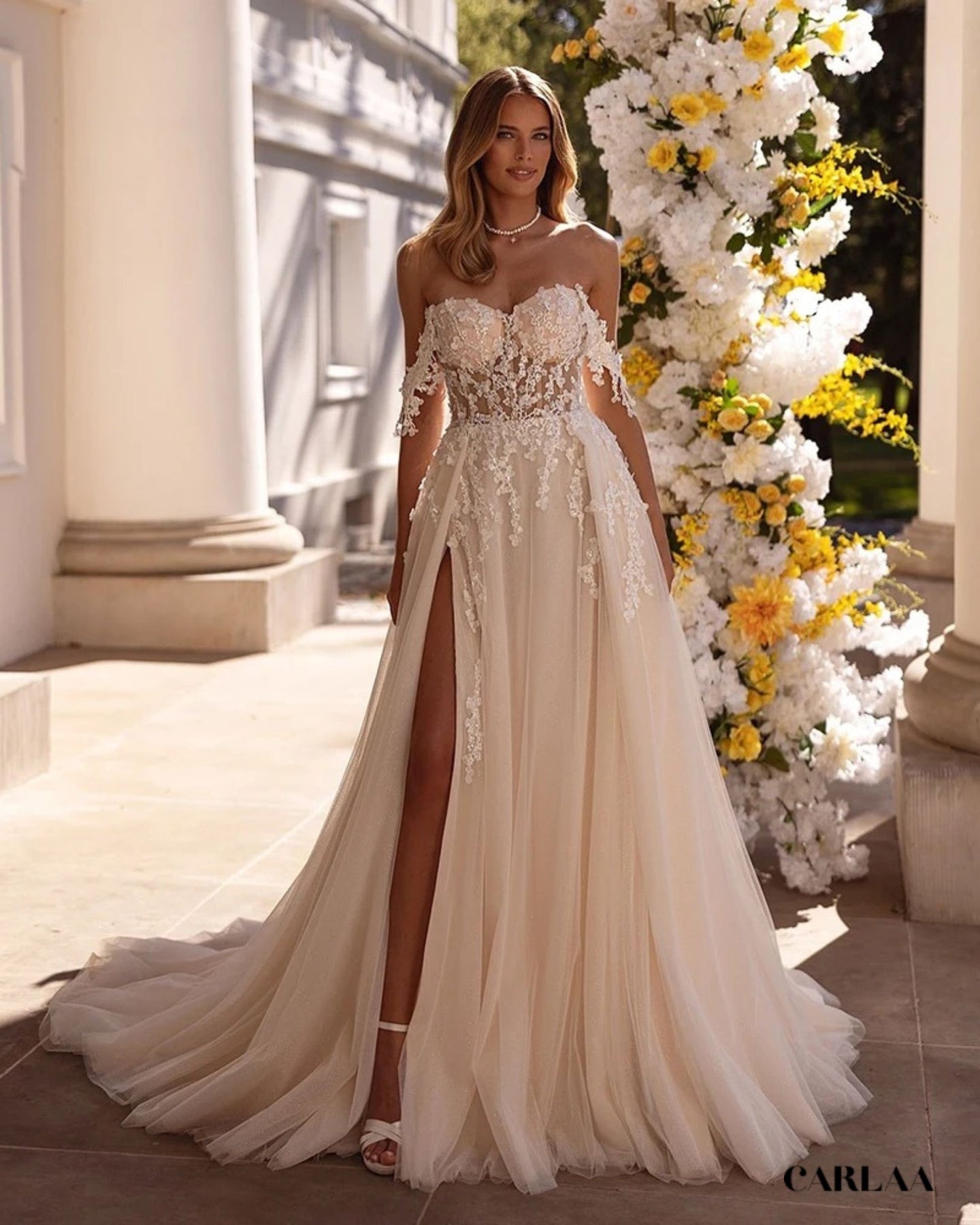 Succombe au charme de cette robe de mariage civil luxueuse, pensée pour sublimer chaque mouvement avec grâce. Son bustier en dentelle transparente délicatement brodée épouse ton buste à la perfection, tandis que les manches tombantes ajoutent une touche de romantisme irrésistible. La jupe en tulle fluide s’ouvre sur une fente subtile, laissant deviner la jambe avec élégance et sensualité. Sa traîne aérienne et ses appliqués floraux scintillants apportent ce qu’il faut de poésie et de glamour pour rendre ton entrée absolument mémorable. Si tu rêves d’une robe à la fois luxueuse, moderne et digne d’un conte de fées, celle-ci fera de toi la véritable héroïne de ce jour unique.