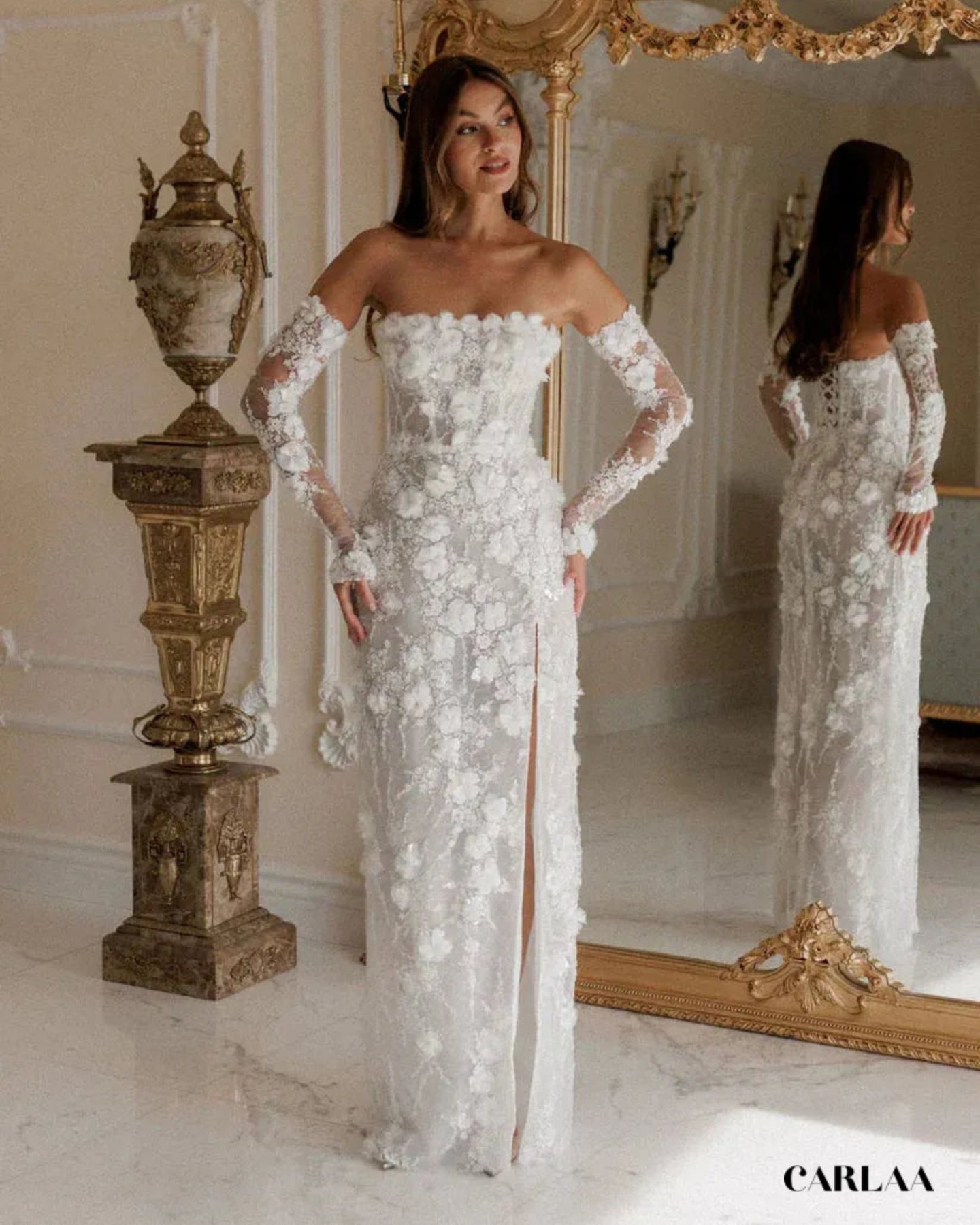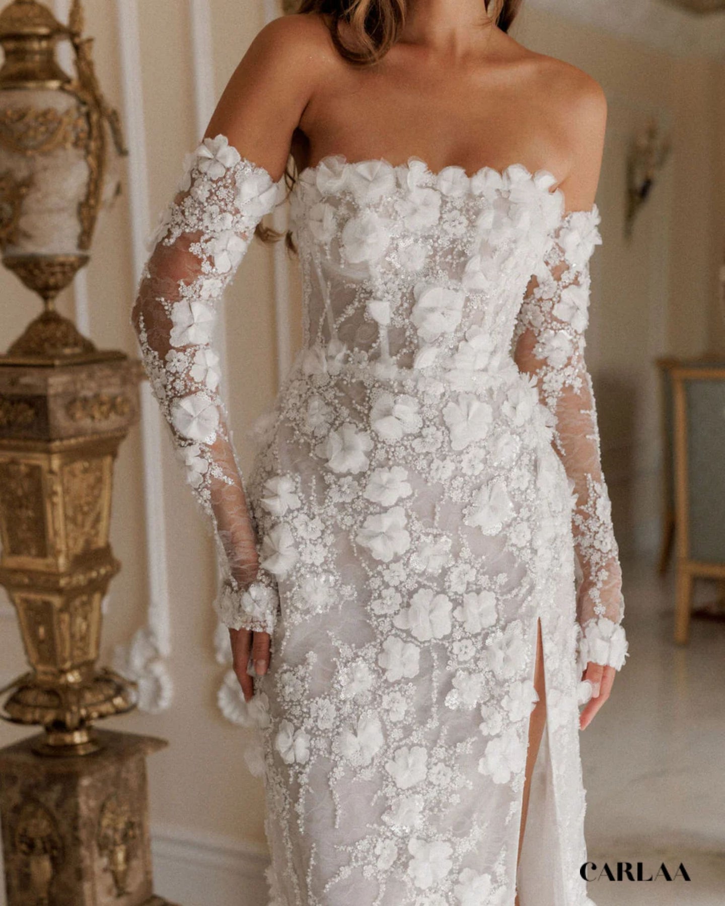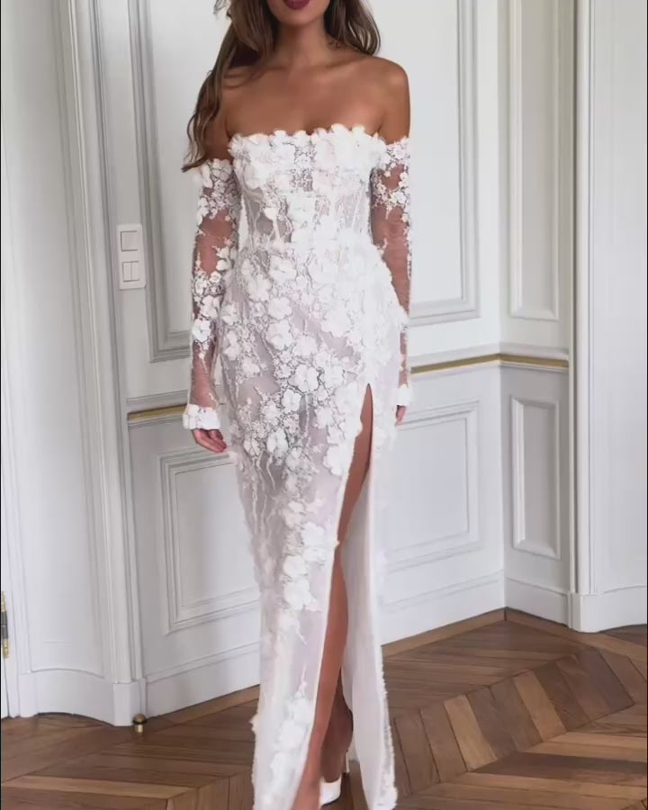 Cette robe de mariée longue en dentelle est un véritable coup de cœur, une pièce qui fait rêver dès le premier regard. On adore son bustier droit, délicatement orné de fleurs en relief, qui met en valeur les épaules et le décolleté avec une élégance naturelle. Les manches longues amovibles en dentelle transparente viennent ajouter une touche de romantisme, comme un voile léger posé sur la peau. La coupe épouse harmonieusement les courbes, souligne la taille, puis tombe dans une jupe longue structurée, raffinée et légèrement fendue sur le devant pour dévoiler la jambe avec subtilité. C’est ce détail qui fait toute la différence : à la fois chic, moderne et incroyablement féminin. À l’arrière, le laçage façon corset apporte ce charme couture irrésistible, tout en permettant un ajustement parfait et un maintien impeccable. La dentelle est riche, texturée, parsemée d’appliqués floraux en 3D qui donnent du relief et captent la lumière en douceur. Chaque détail semble pensé pour sublimer la mariée sans en faire trop : c’est raffiné, poétique et terriblement élégant.