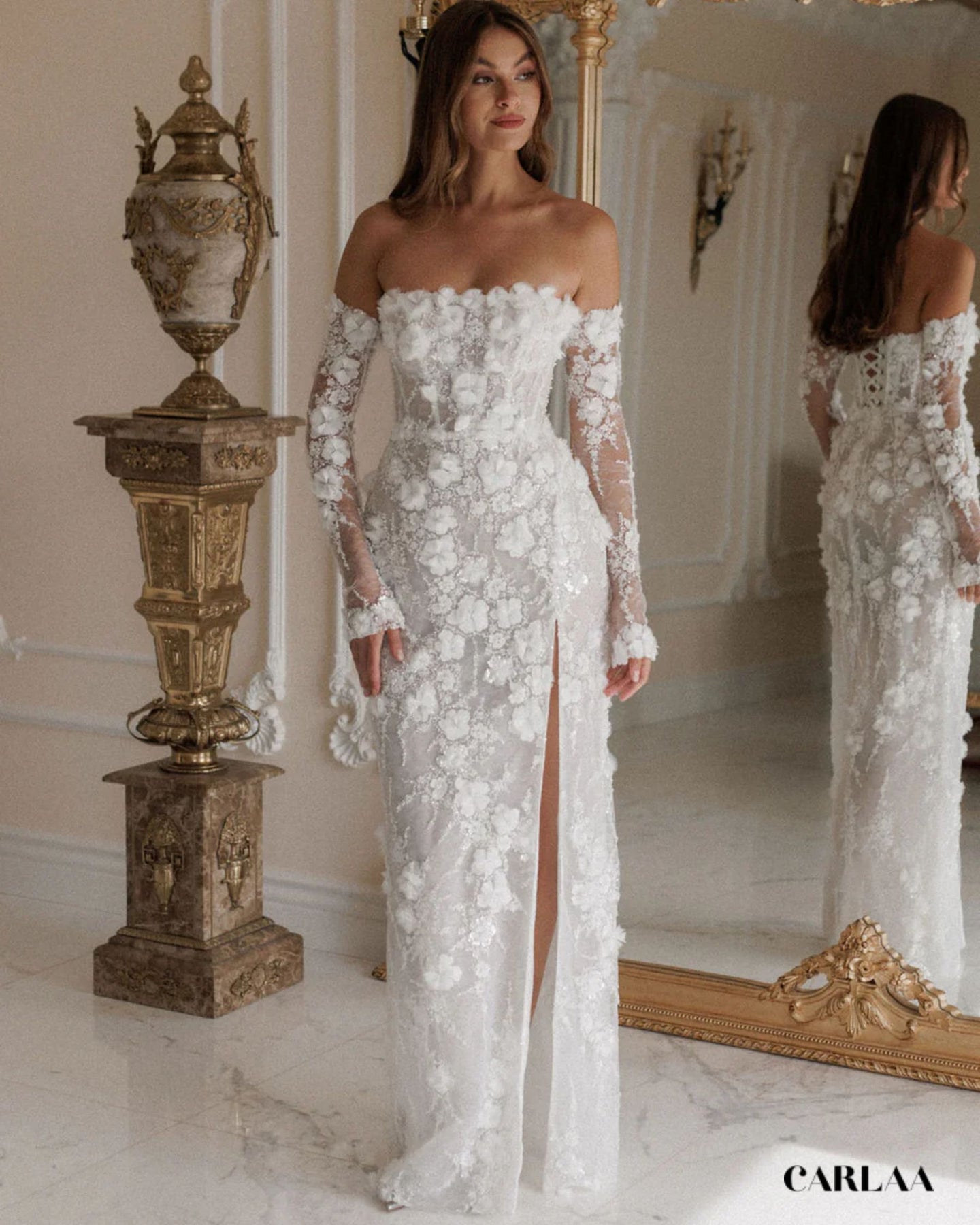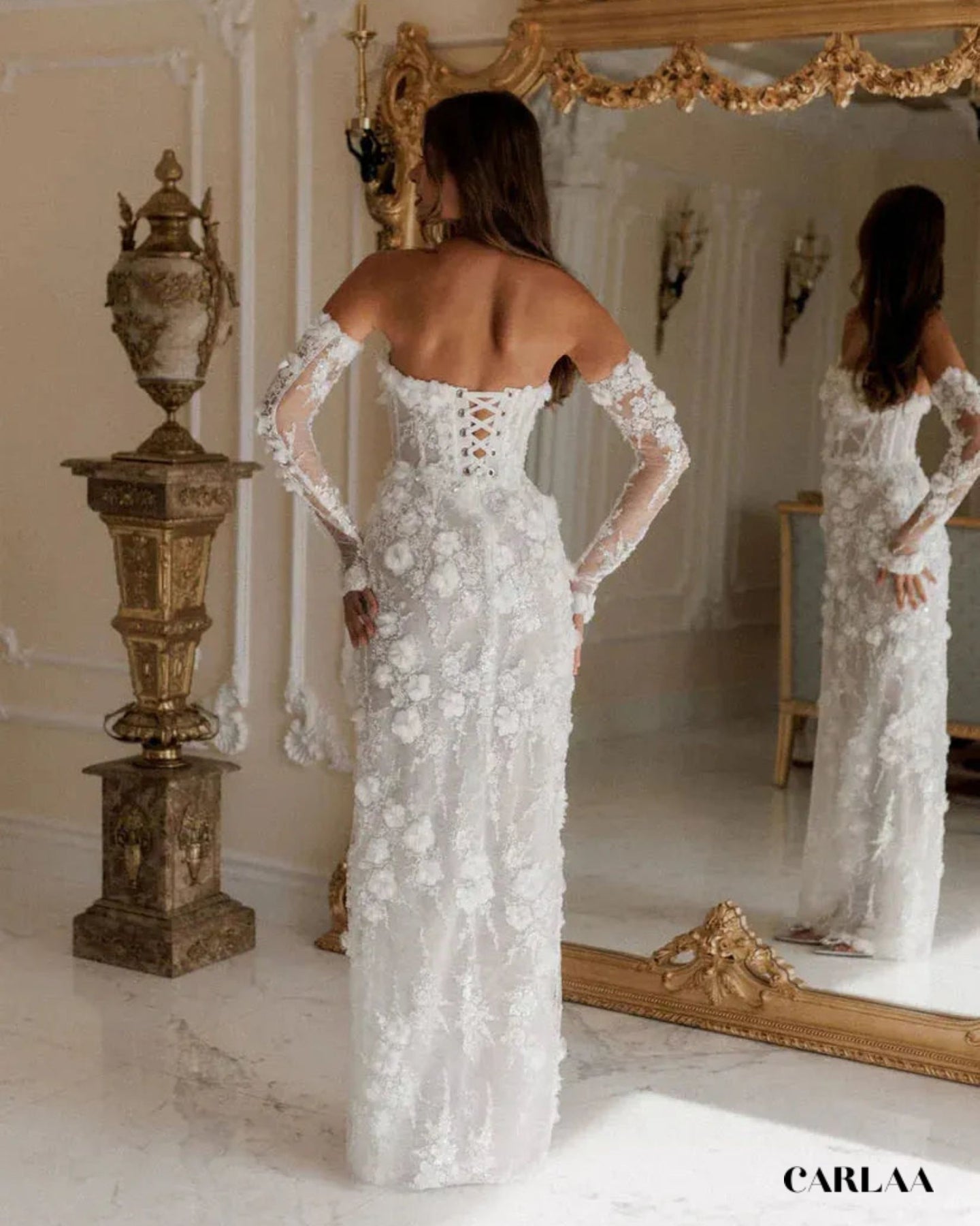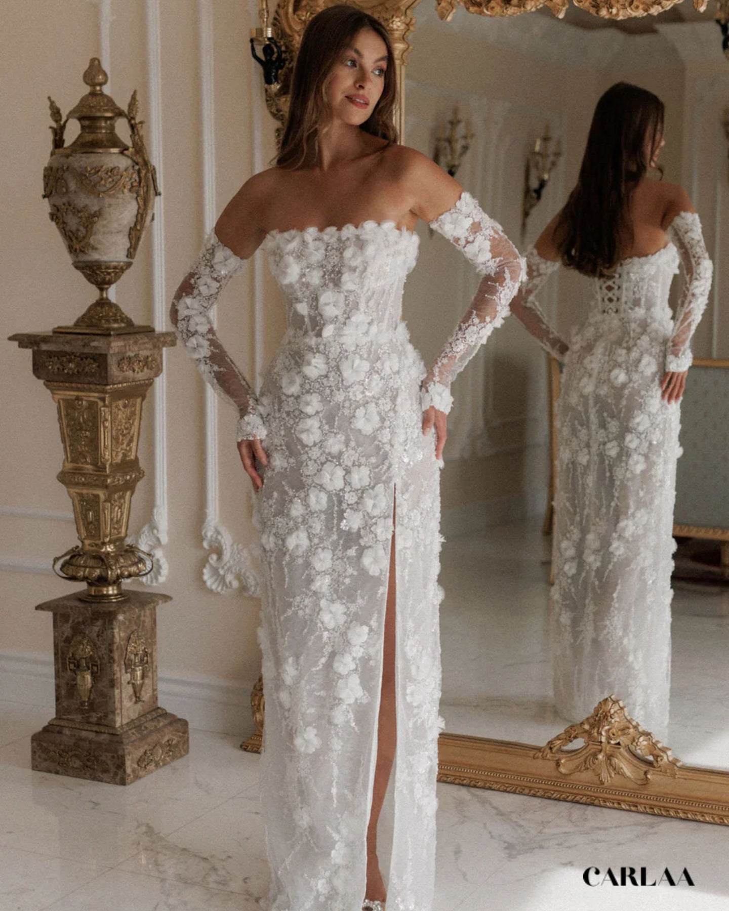 Cette robe de mariée longue en dentelle est un véritable coup de cœur, une pièce qui fait rêver dès le premier regard. On adore son bustier droit, délicatement orné de fleurs en relief, qui met en valeur les épaules et le décolleté avec une élégance naturelle. Les manches longues amovibles en dentelle transparente viennent ajouter une touche de romantisme, comme un voile léger posé sur la peau. La coupe épouse harmonieusement les courbes, souligne la taille, puis tombe dans une jupe longue structurée, raffinée et légèrement fendue sur le devant pour dévoiler la jambe avec subtilité. C’est ce détail qui fait toute la différence : à la fois chic, moderne et incroyablement féminin. À l’arrière, le laçage façon corset apporte ce charme couture irrésistible, tout en permettant un ajustement parfait et un maintien impeccable. La dentelle est riche, texturée, parsemée d’appliqués floraux en 3D qui donnent du relief et captent la lumière en douceur. Chaque détail semble pensé pour sublimer la mariée sans en faire trop : c’est raffiné, poétique et terriblement élégant.