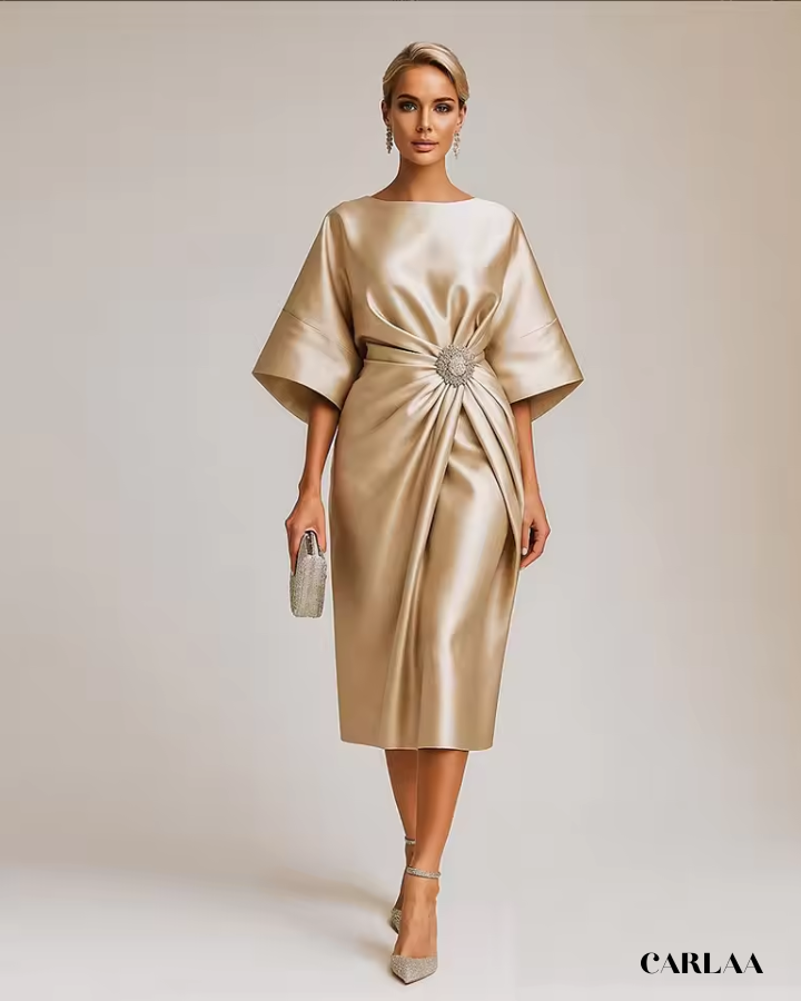 Les manches kimono amples apportent une touche d'élégance intemporelle tout en offrant un confort absolu pour profiter pleinement de cette journée exceptionnelle. Le drapé sophistiqué à la taille, sublimé par une broche ornementale étincelante, sculpte délicatement ta silhouette et crée un point focal éblouissant. La texture satinée luxueuse capte magnifiquement la lumière, te permettant de rayonner naturellement aux côtés de la mariée sans jamais voler la vedette. Cette robe mère de la mariée dorée à longueur genoux propose l'équilibre parfait entre élégance classique et modernité assumée. Le col bateau flatteur encadre harmonieusement ton visage tandis que la coupe droite apporte une allure majestueuse qui traverse les générations. Accompagne cette pièce d'exception d'escarpins raffinés et d'une pochette scintillante pour incarner la mère radieuse et sophistiquée que tu es. Fais de ce jour mémorable un moment où tu te sentiras absolument magnifique et confiante.
