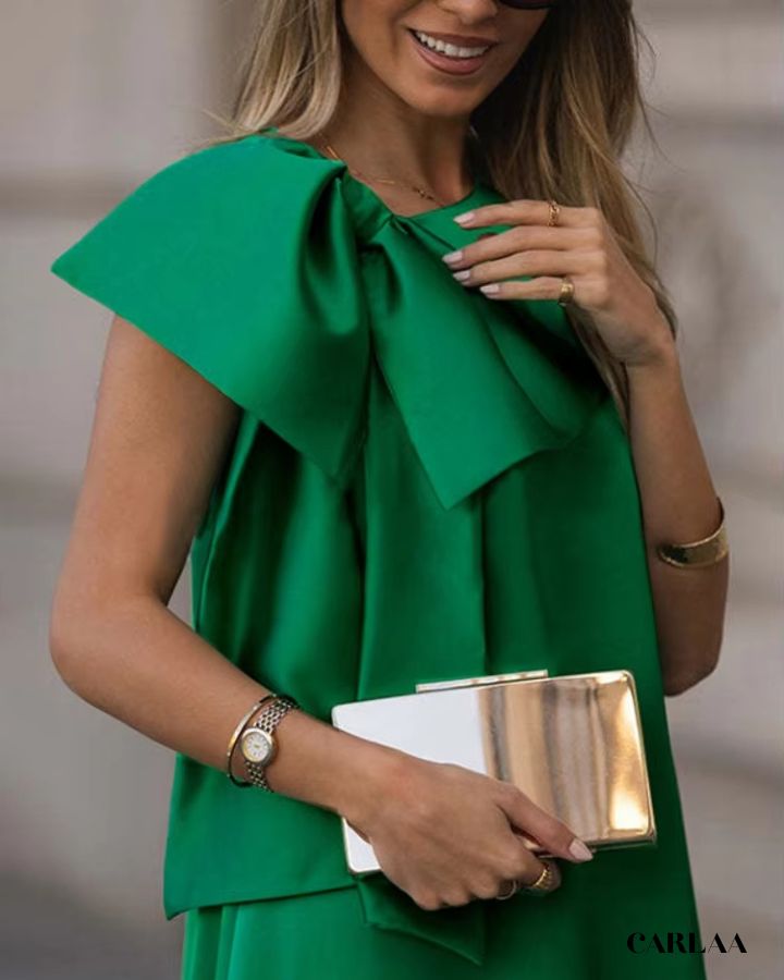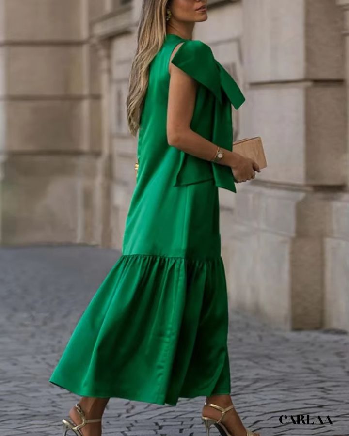 Sa coupe fluide met en valeur la silhouette tout en offrant un confort absolu, idéale pour briller lors d’un mariage, d’une garden party ou d’une réception chic. Le grand nœud sur l’épaule ajoute une touche couture audacieuse, symbole d’une féminité assumée et sophistiquée.