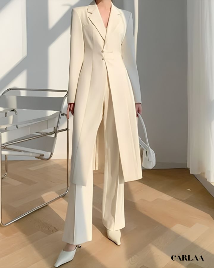 Sa coupe longue et structurée allonge la silhouette, offrant une allure à la fois puissante et féminine. Idéal pour un mariage civil, une cérémonie minimaliste ou un événement raffiné, ce look incarne l’élégance intemporelle signée CARLAA.